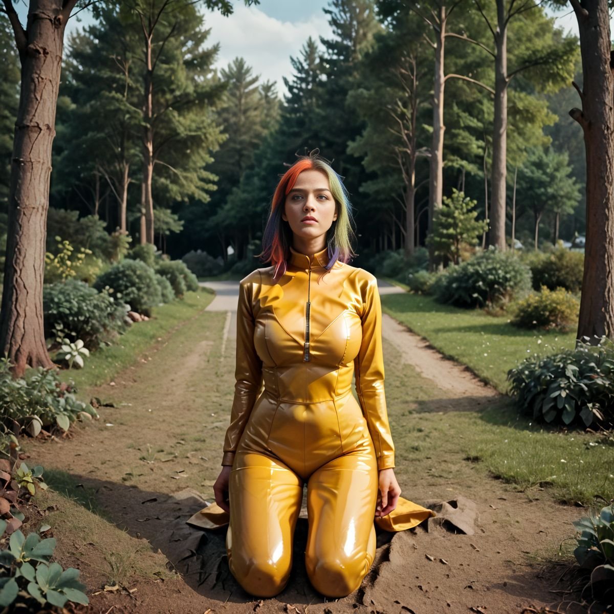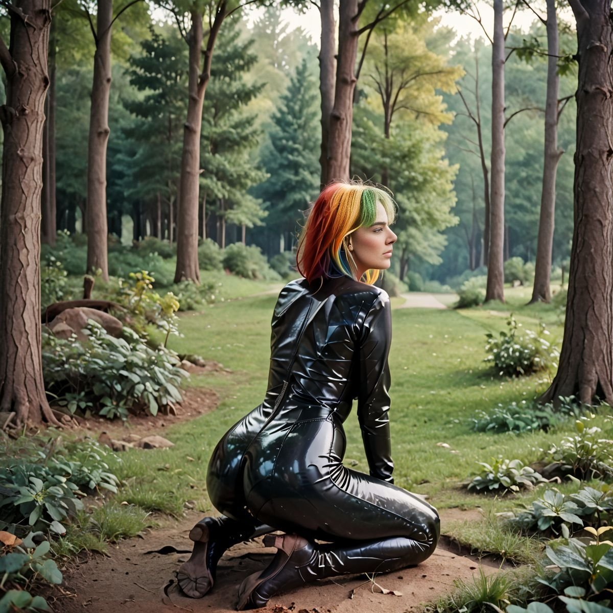 Clara knelt before the tree, her hands resting on the rough bark. The catsuit’s colors swirled around her, a kaleidoscope of hues that seemed to merge with the earth beneath her, grounding her in the moment.