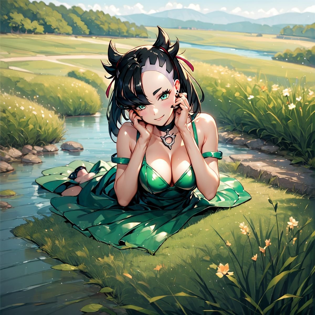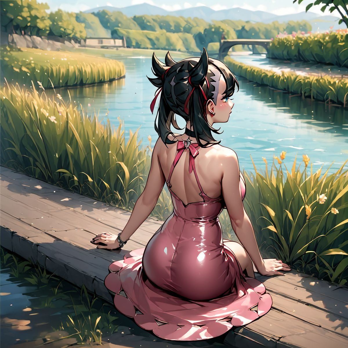 The river flowed gently beside her, its waters sparkling in the sunlight. Marnie leaned over the edge, watching as a few Pokémon waded in the shallows, their playful interactions drawing her attention. She smiled faintly, though the expression didn’t reach her eyes. There was something about the water that made her feel… grounded.