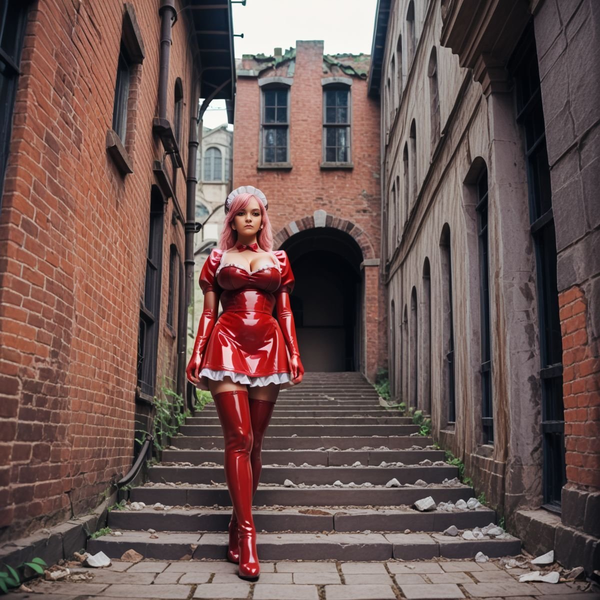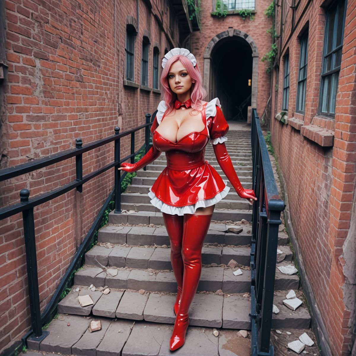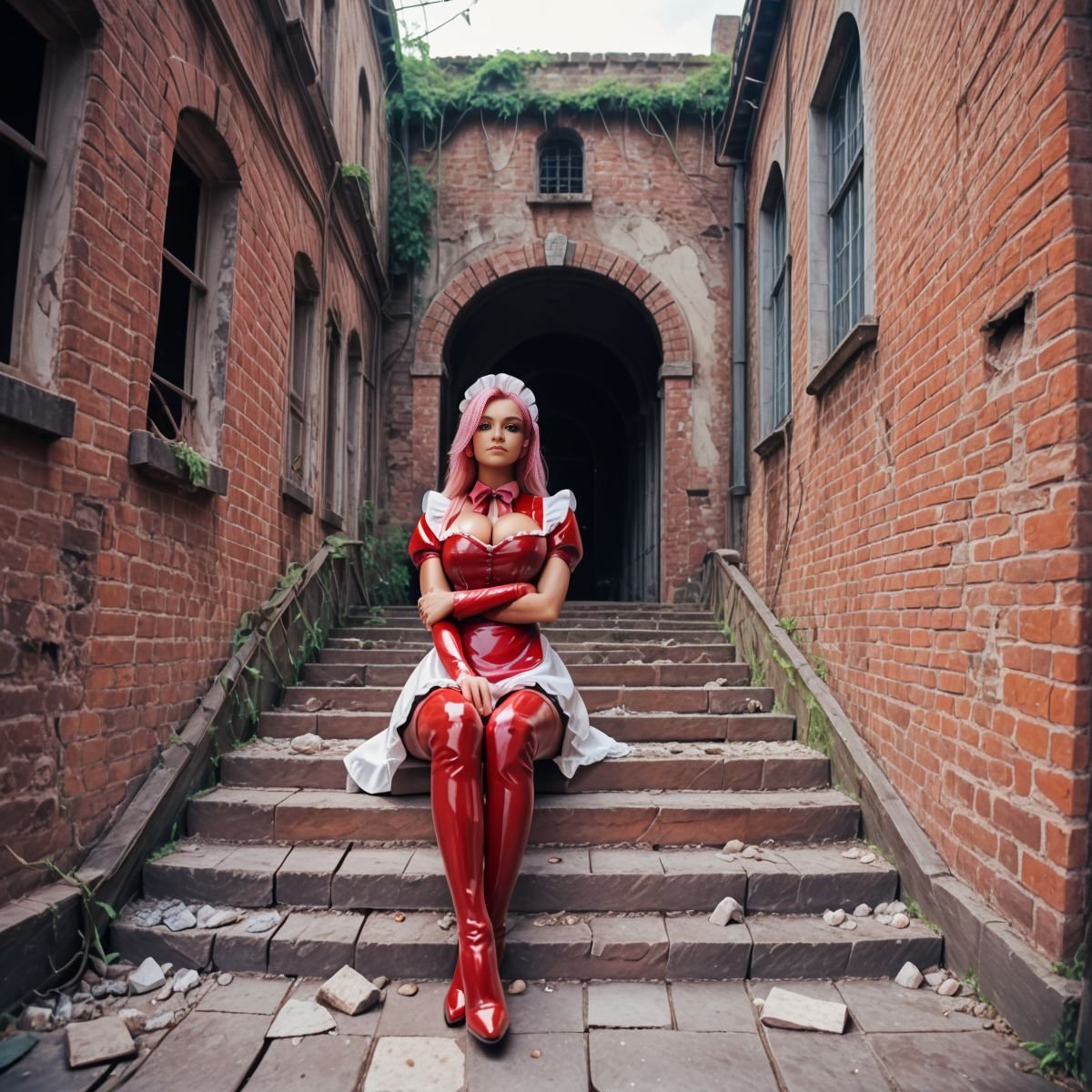 The young woman stands atop the concrete stairs leading up to the abandoned brick building, her pink hair catching the breeze as she poses seductively in her tight-fitting red latex maid’s outfit. The sun shines down on her curves, accentuating her sexiness as she plays with a feather duster, pretending to clean the building but really just flaunting her sexuality.