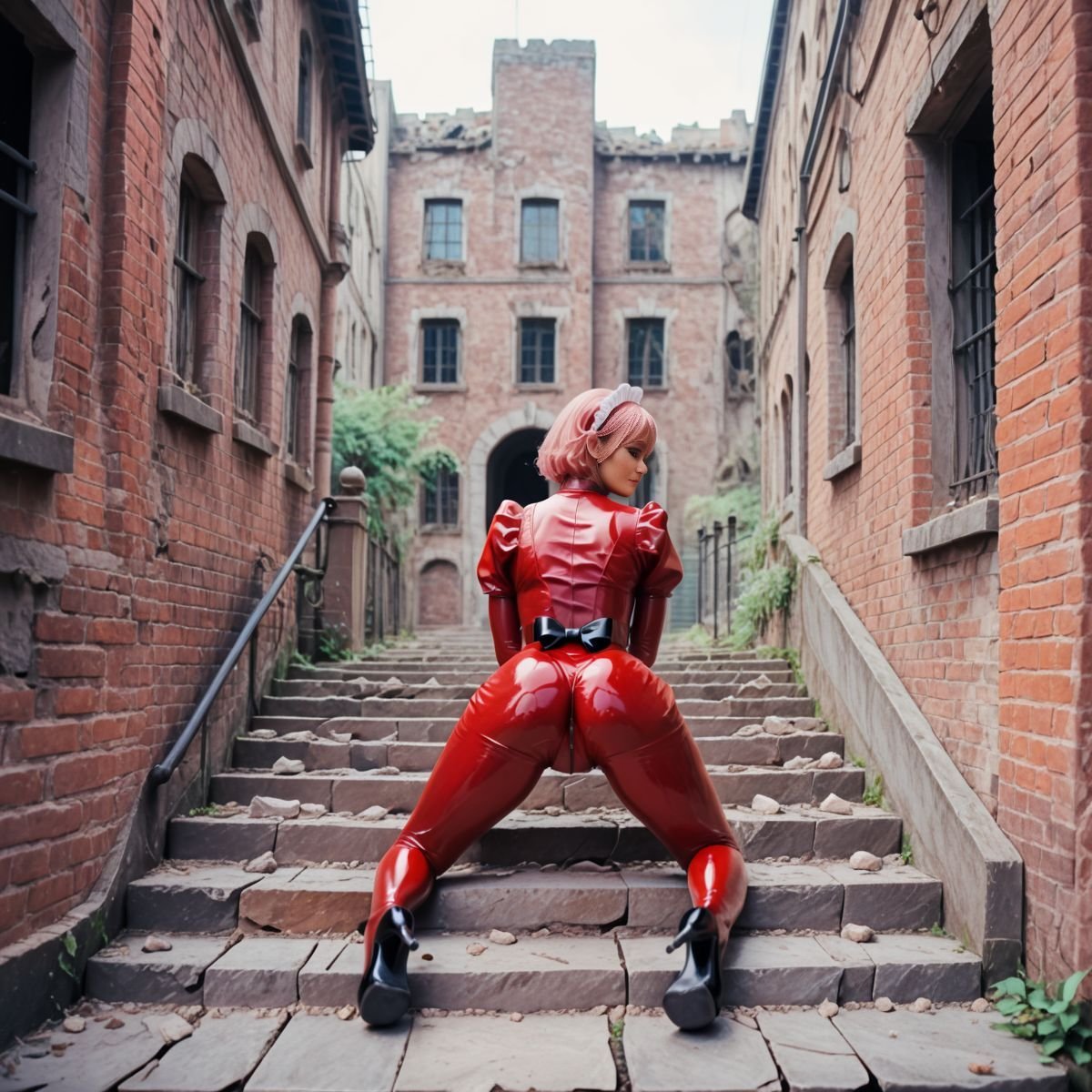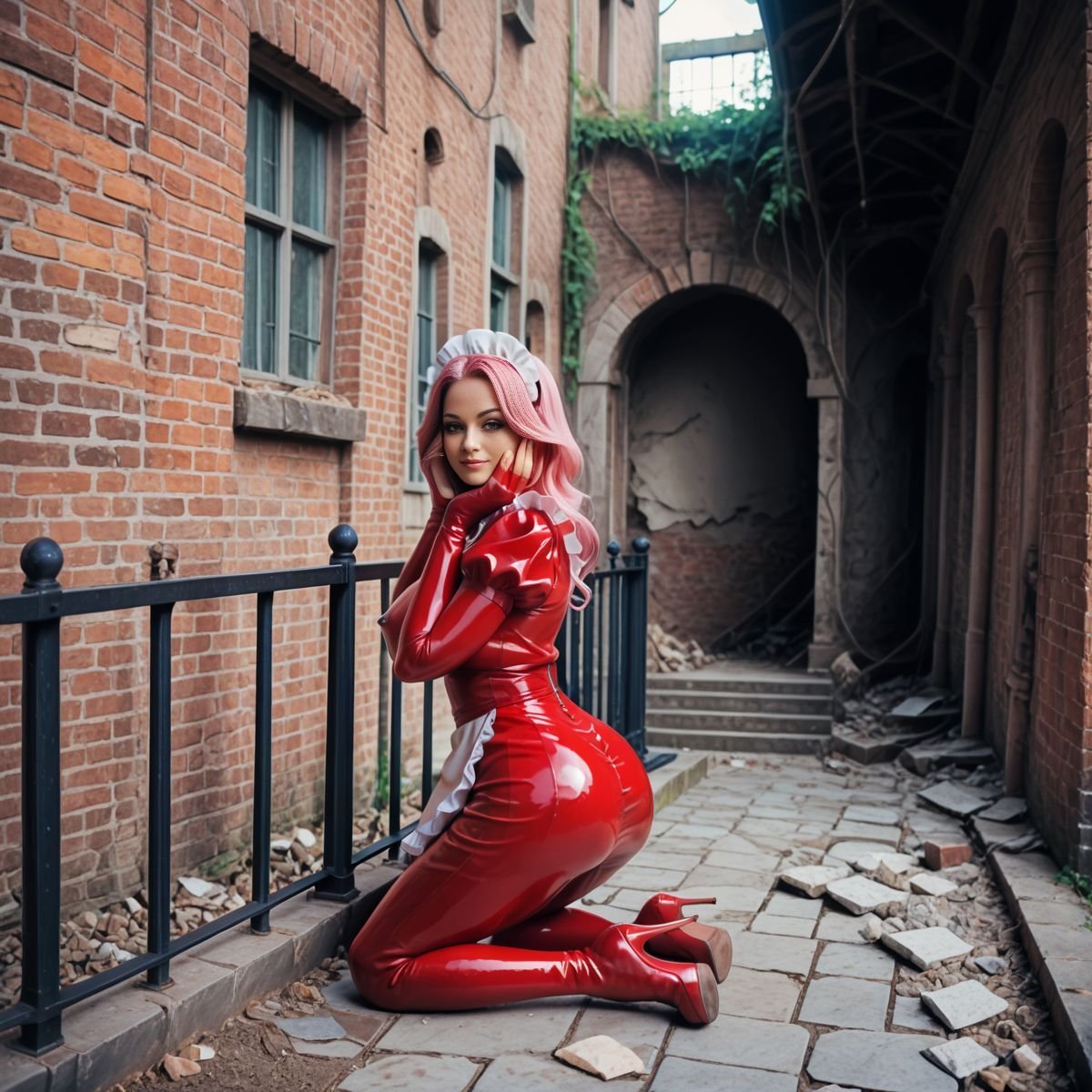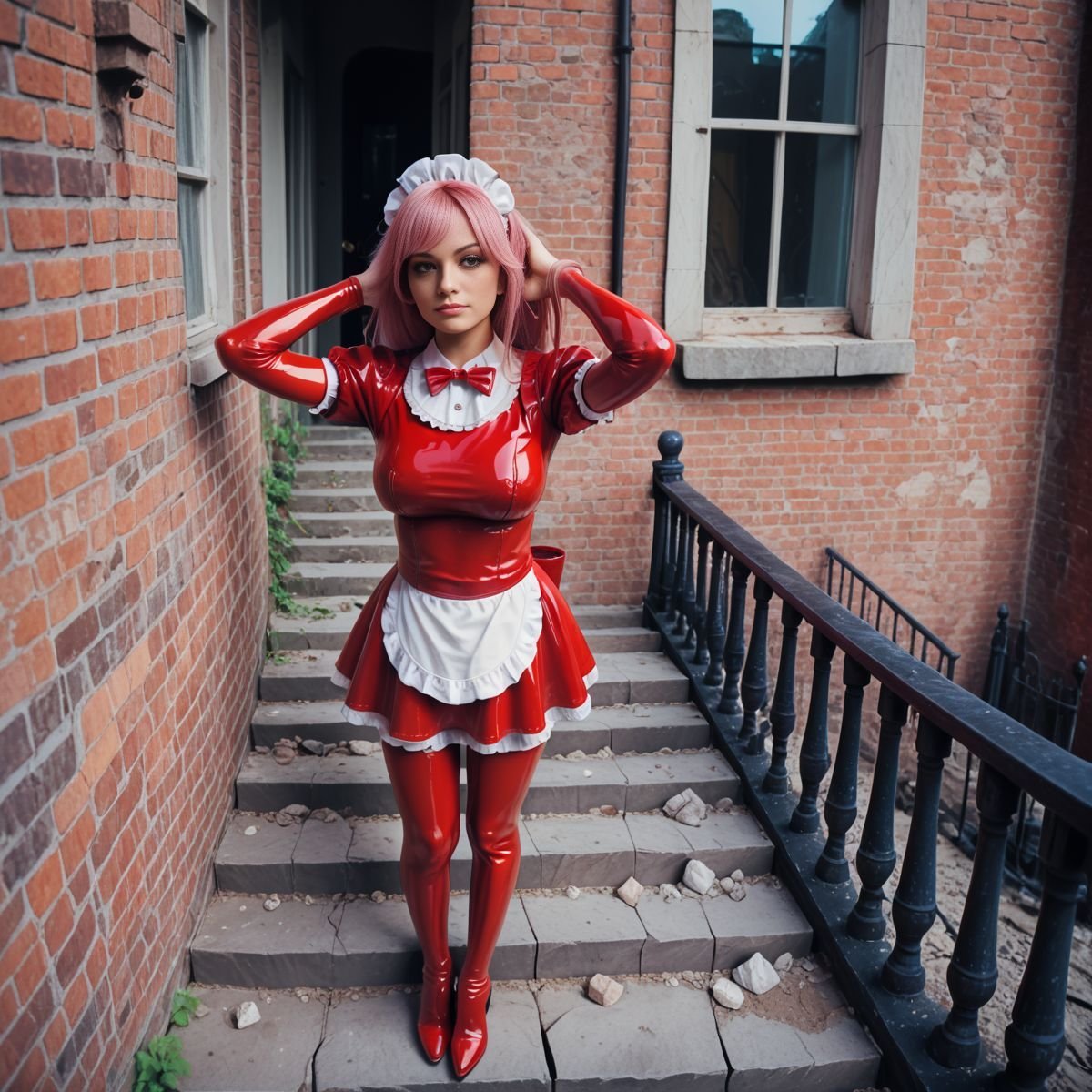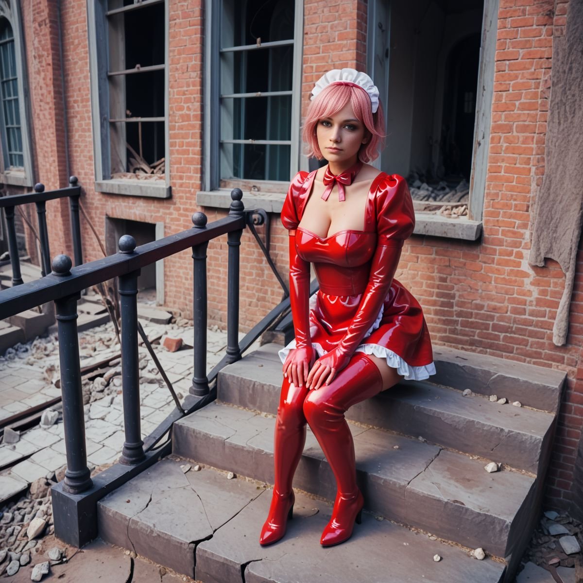 The young woman stands atop the concrete stairs leading up to the abandoned brick building, her pink hair catching the breeze as she poses seductively in her tight-fitting red latex maid’s outfit. The sun shines down on her curves, accentuating her sexiness as she plays with a feather duster, pretending to clean the building but really just flaunting her sexuality.