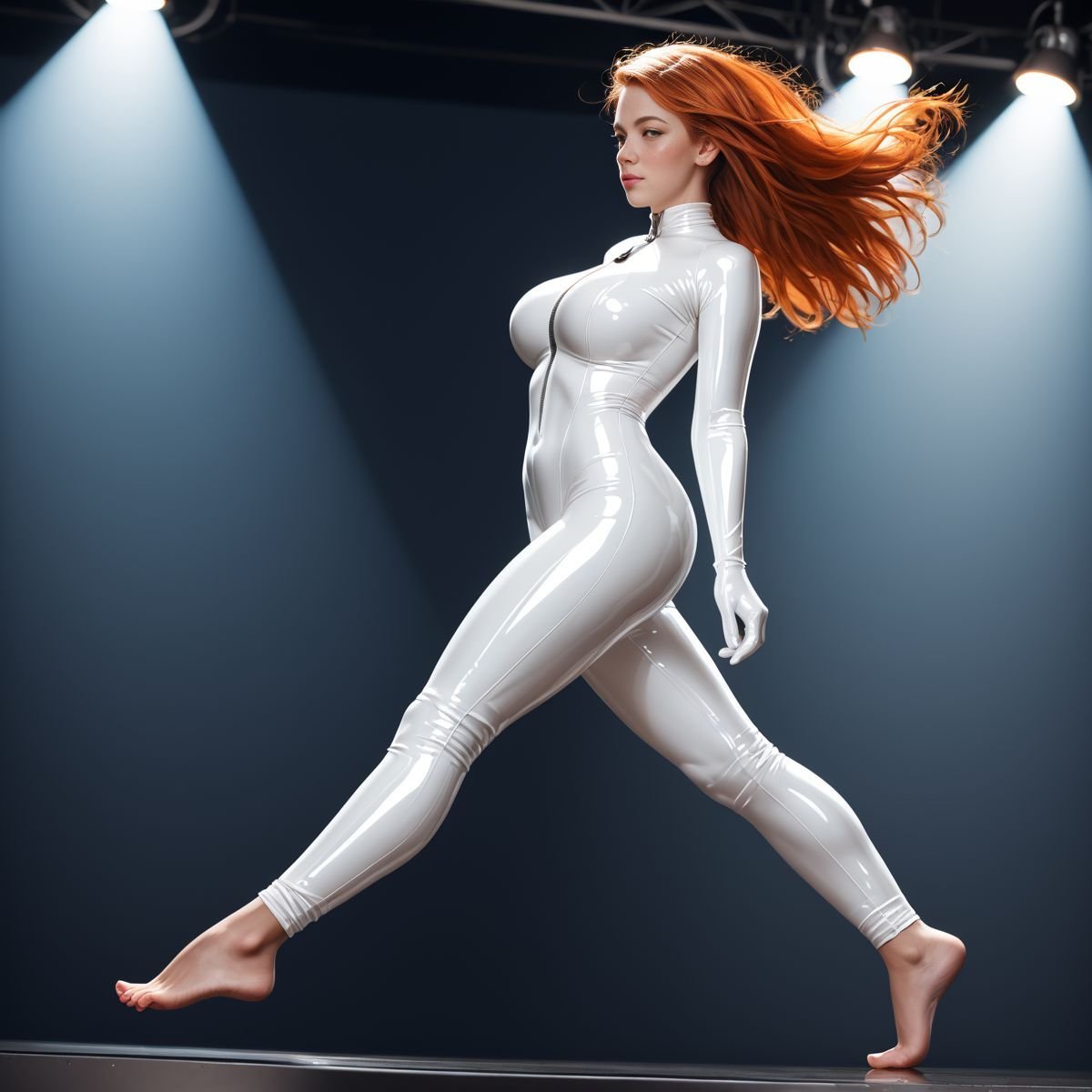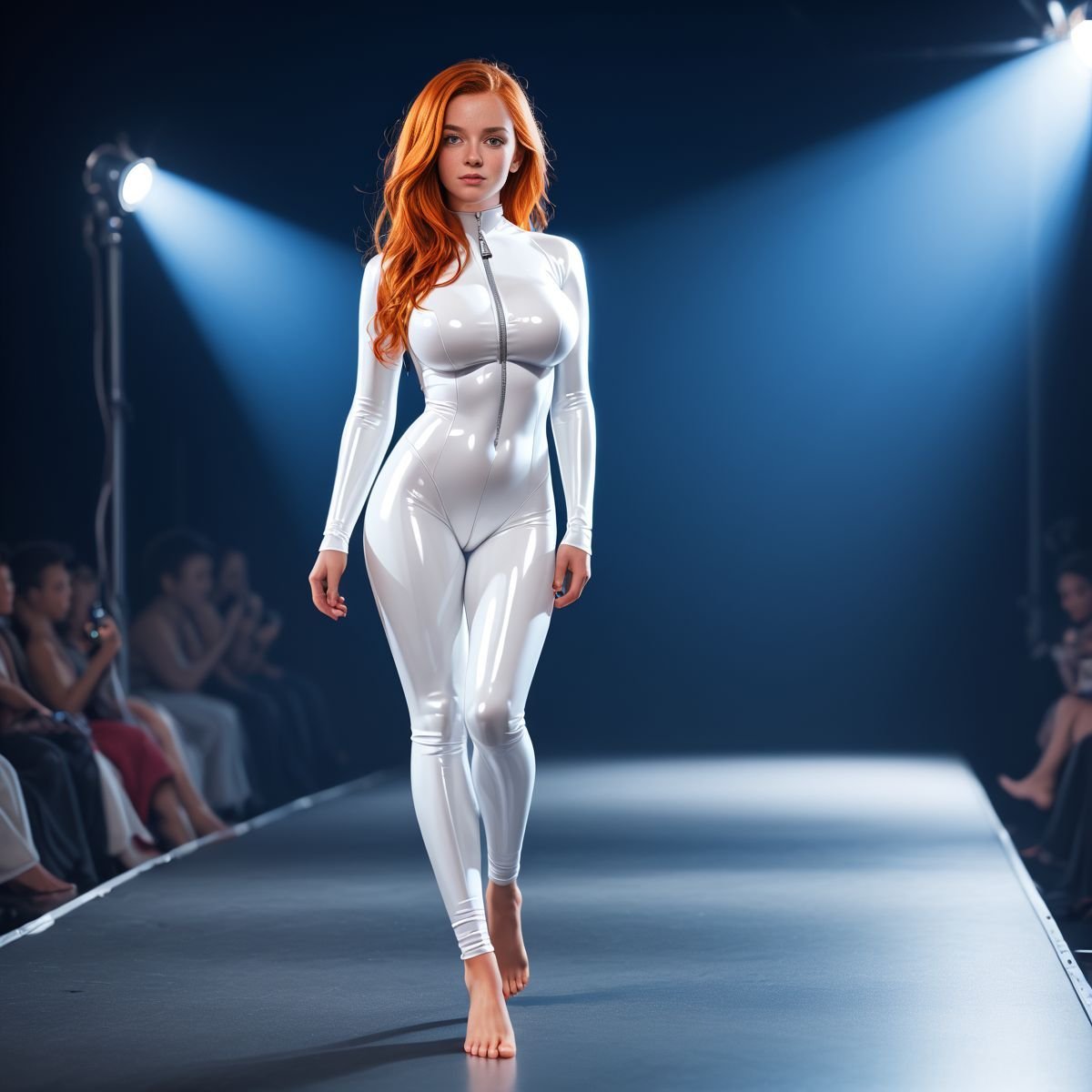 I am Amy, the red-haired woman who loves wearing latex catsuits. Today is a special day for me because I will be modeling a large number of different colors on the runway at the modeling agency. Each color represents a different aspect of my personality, and I can’t wait to show them all off.