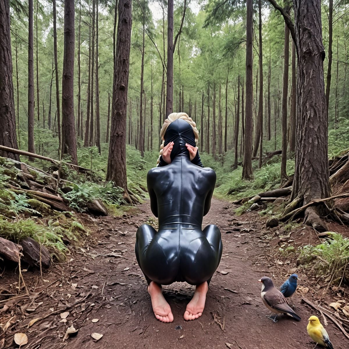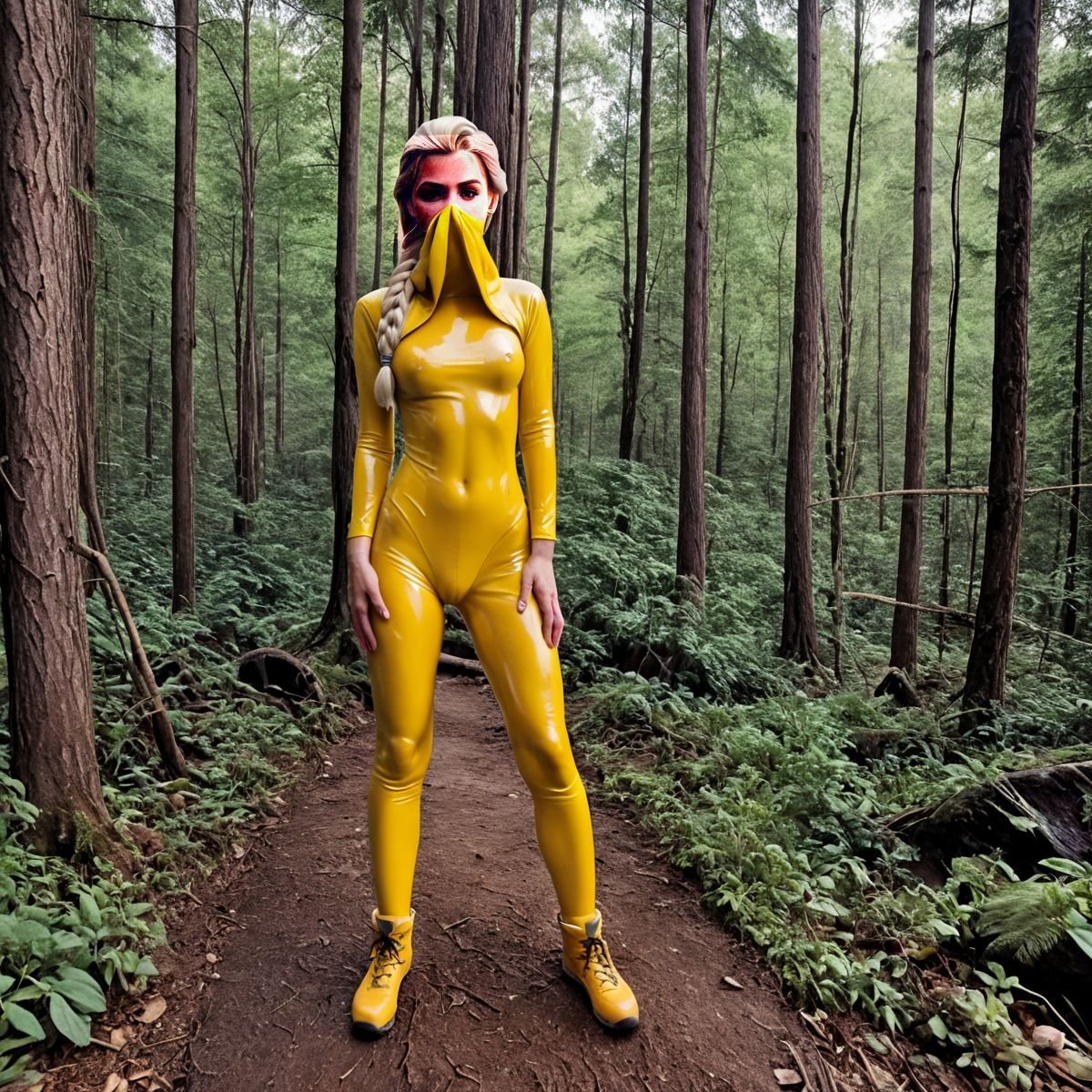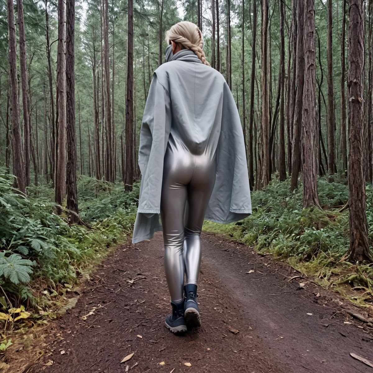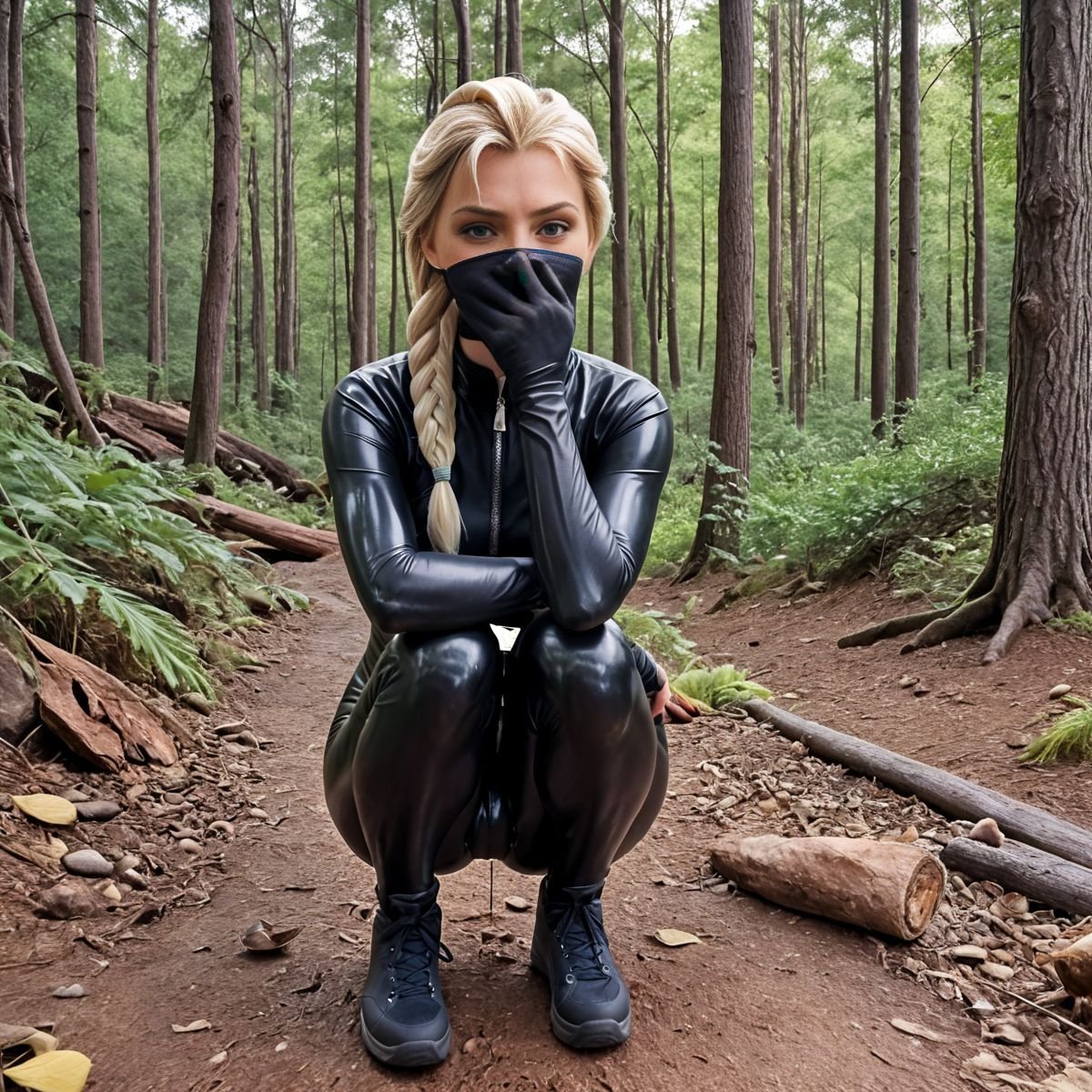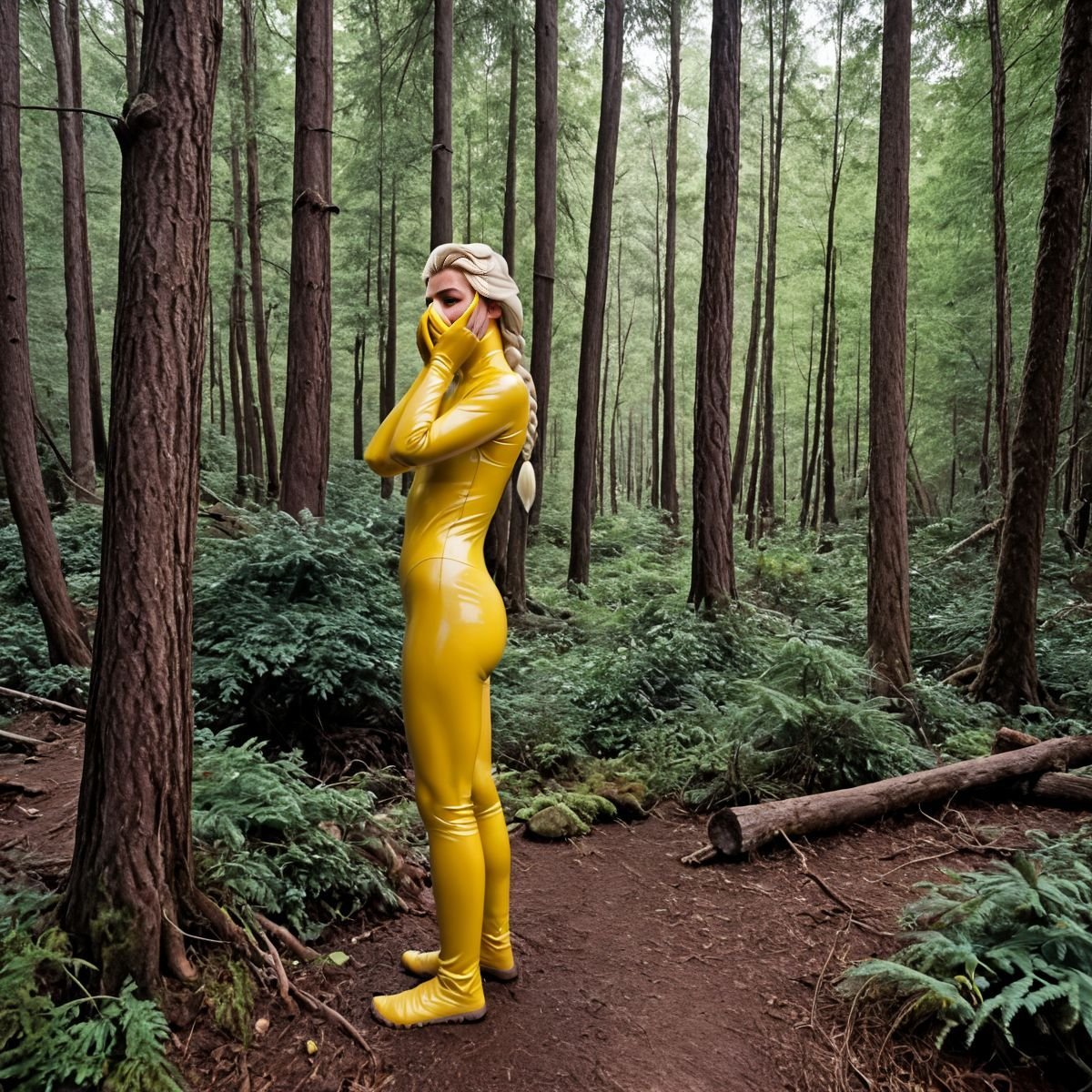 Elsa, dressed in a full latex catsuit, set out on a hike in the forest. It was a beautiful summer day with the sun shining brightly through the trees. The warmth of the sun felt good on her skin, and she was happy to be alone in nature. The sound of birds chirping and the rustling of leaves underfoot filled her ears.