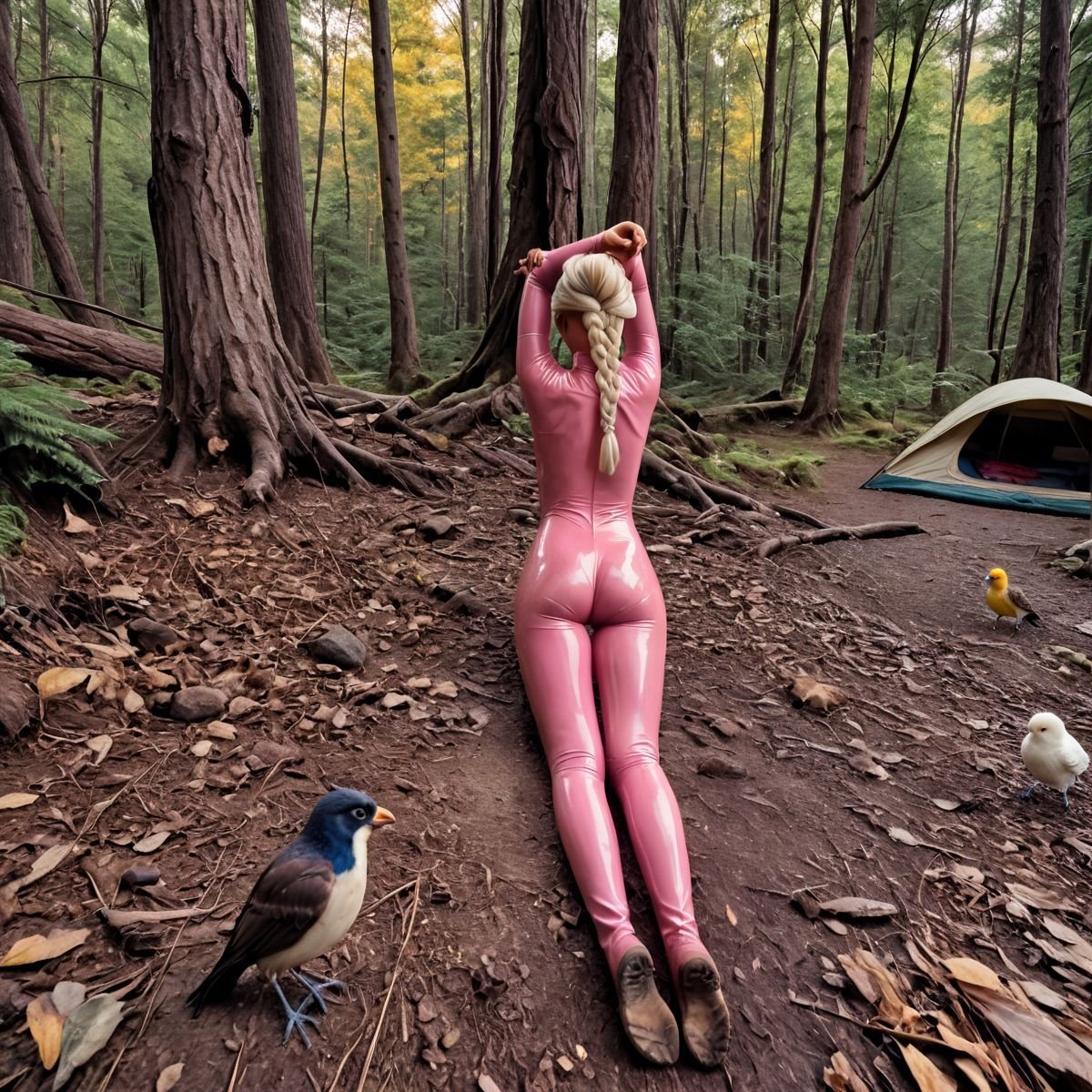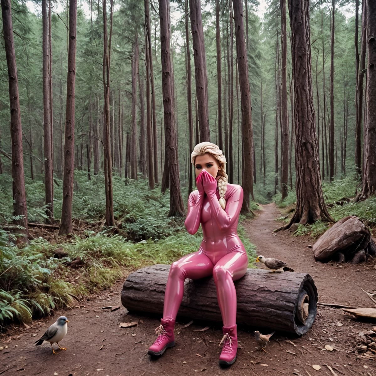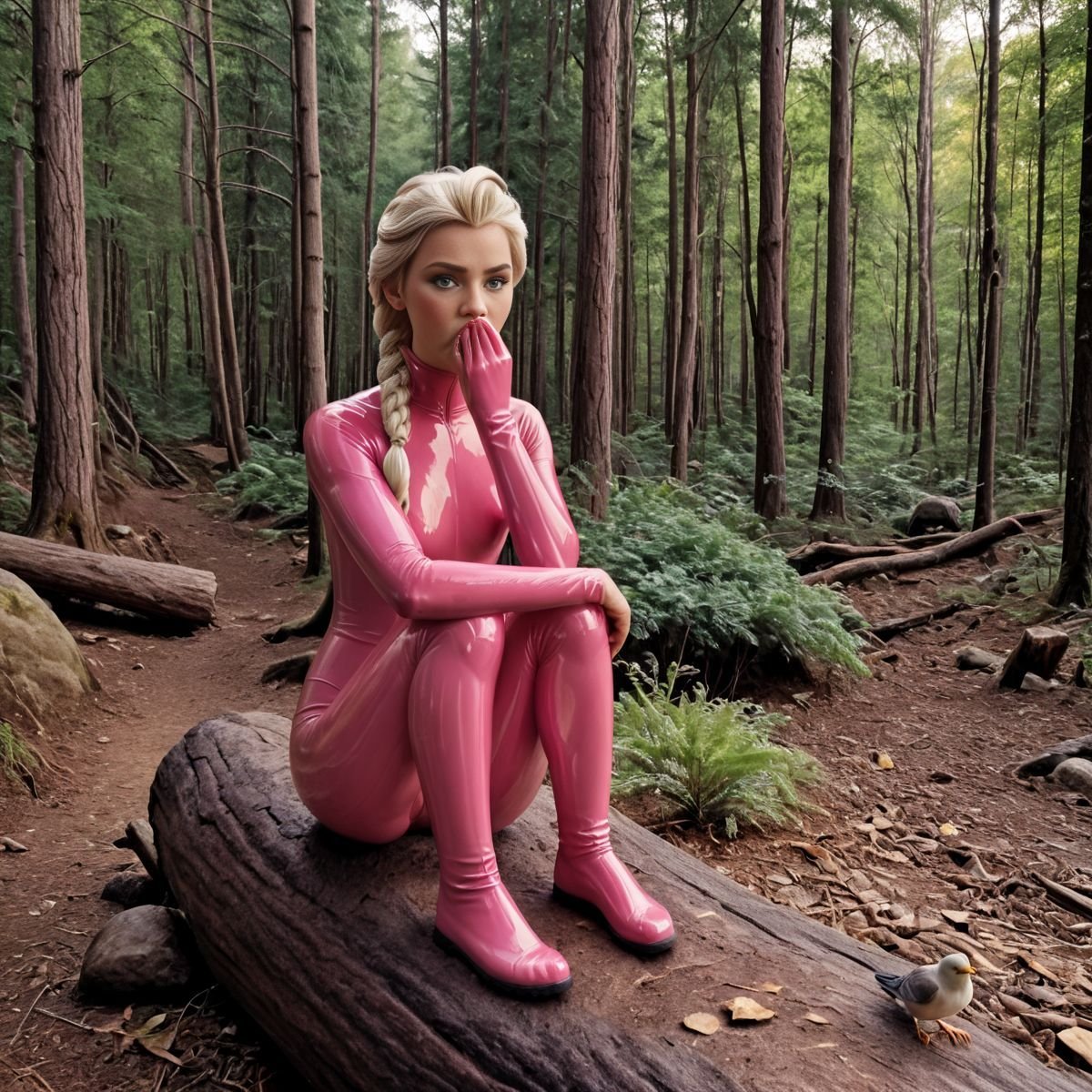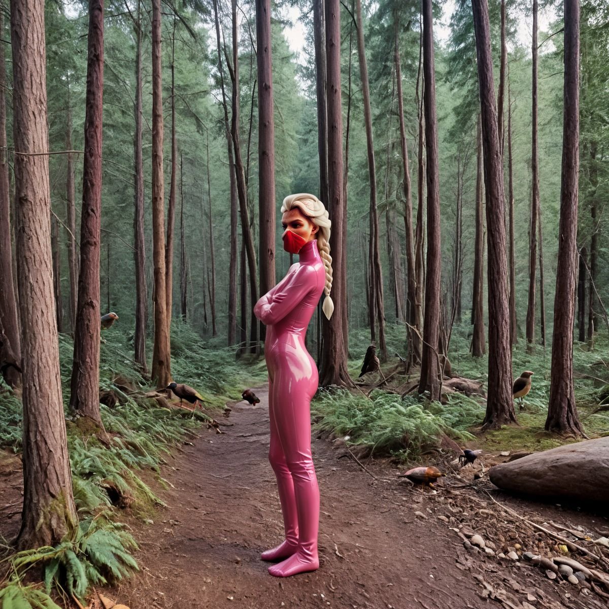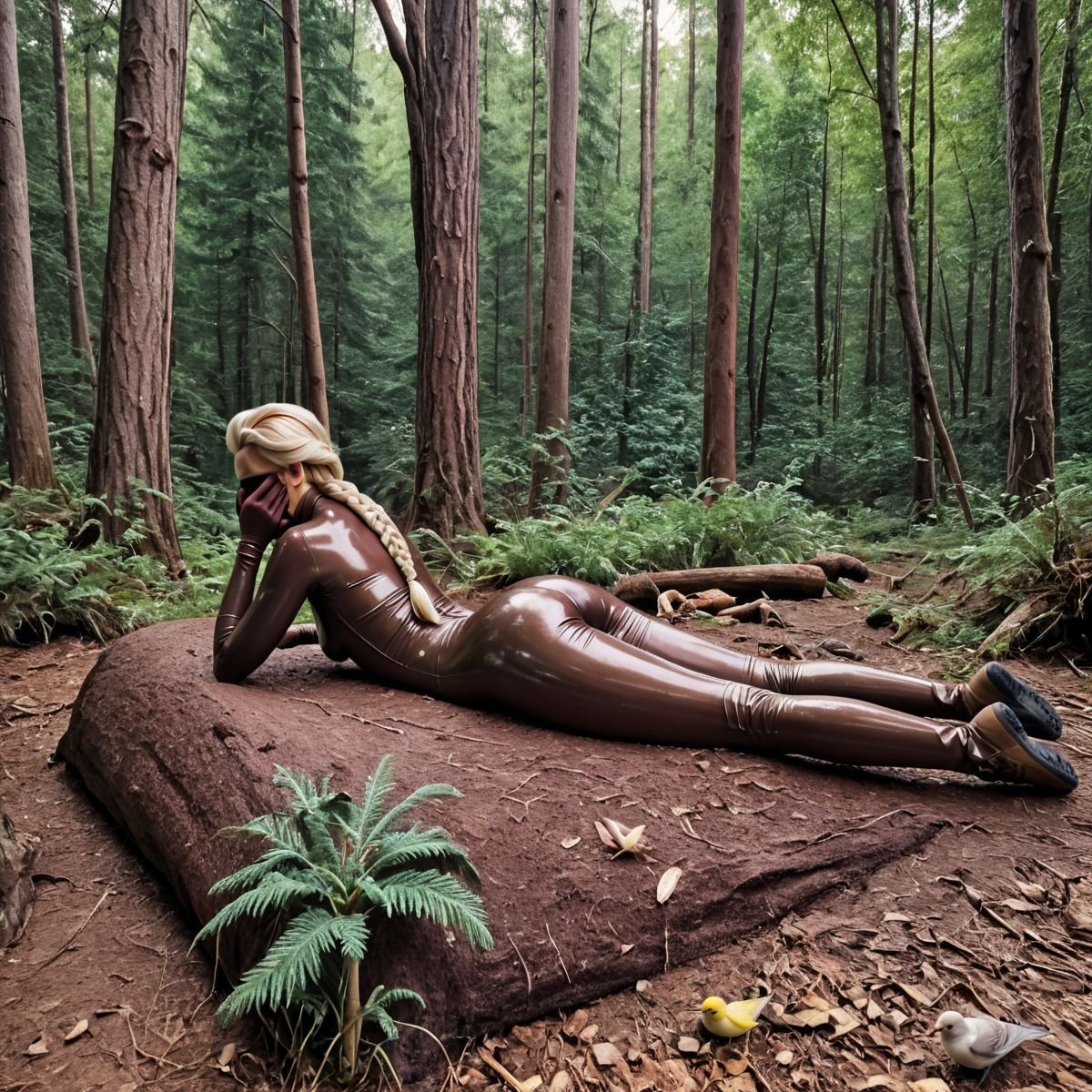 Elsa, dressed in a full latex catsuit, set out on a hike in the forest. It was a beautiful summer day with the sun shining brightly through the trees. The warmth of the sun felt good on her skin, and she was happy to be alone in nature. The sound of birds chirping and the rustling of leaves underfoot filled her ears.