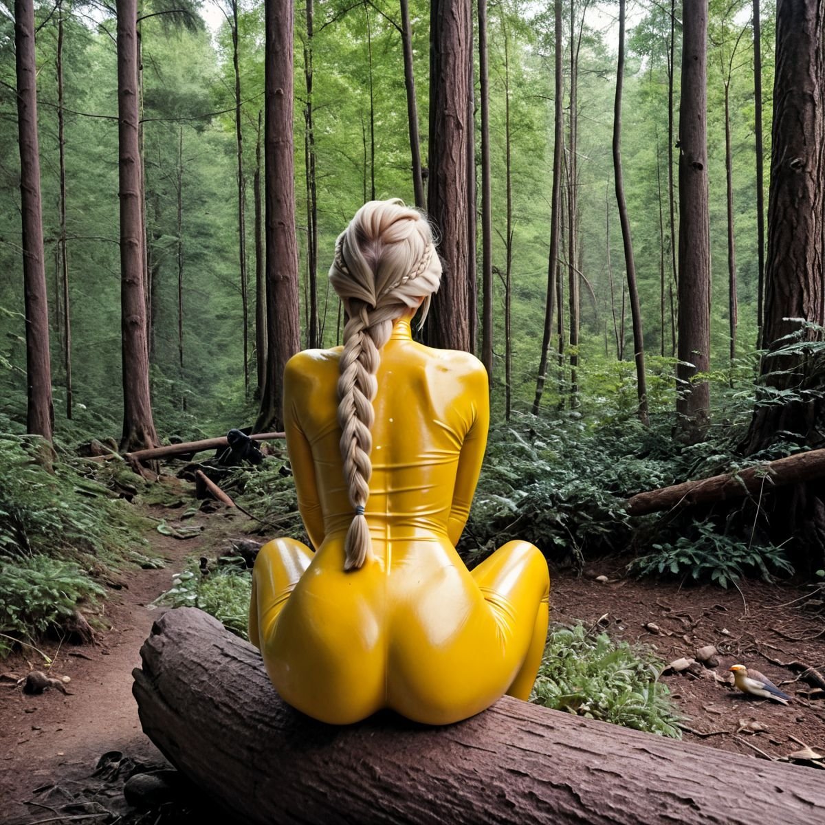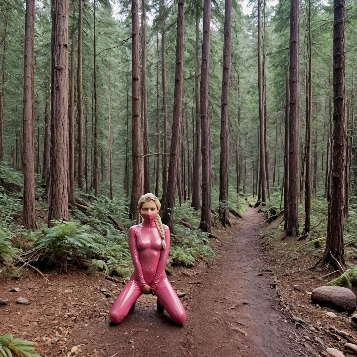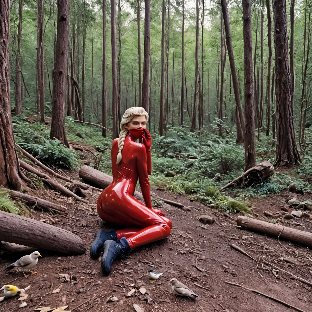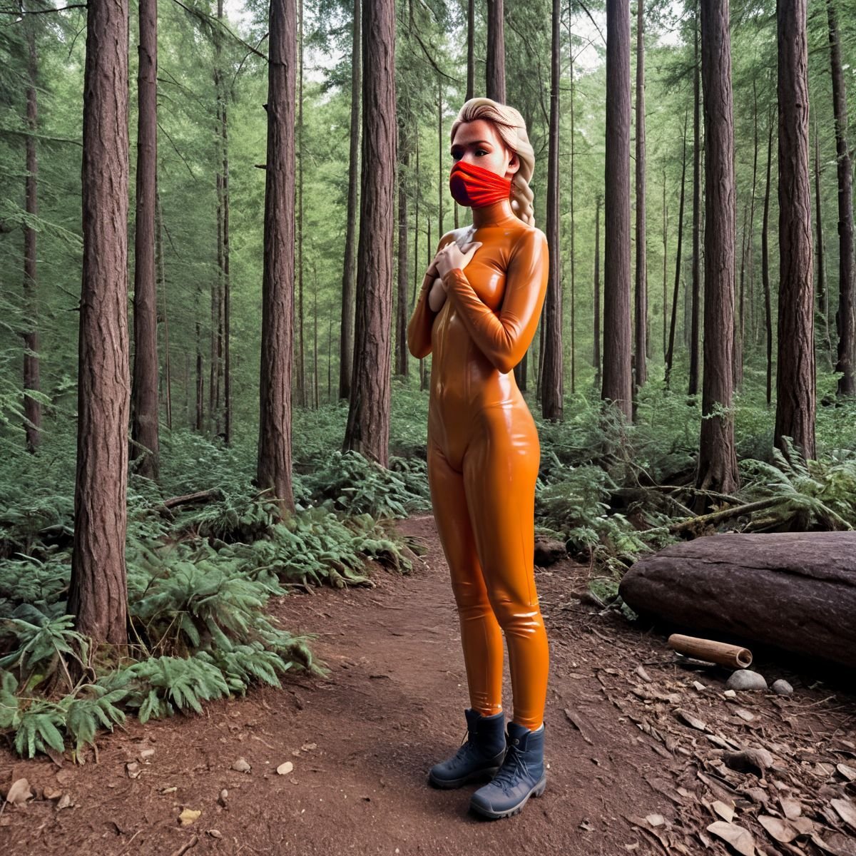 Elsa, dressed in a full latex catsuit, set out on a hike in the forest. It was a beautiful summer day with the sun shining brightly through the trees. The warmth of the sun felt good on her skin, and she was happy to be alone in nature. The sound of birds chirping and the rustling of leaves underfoot filled her ears.