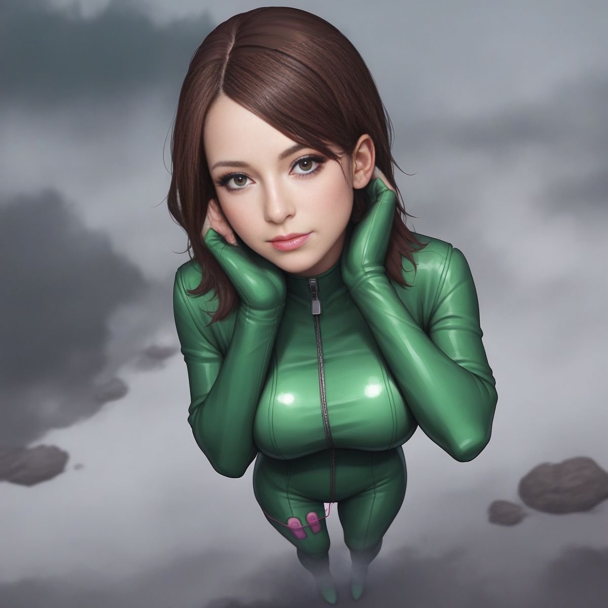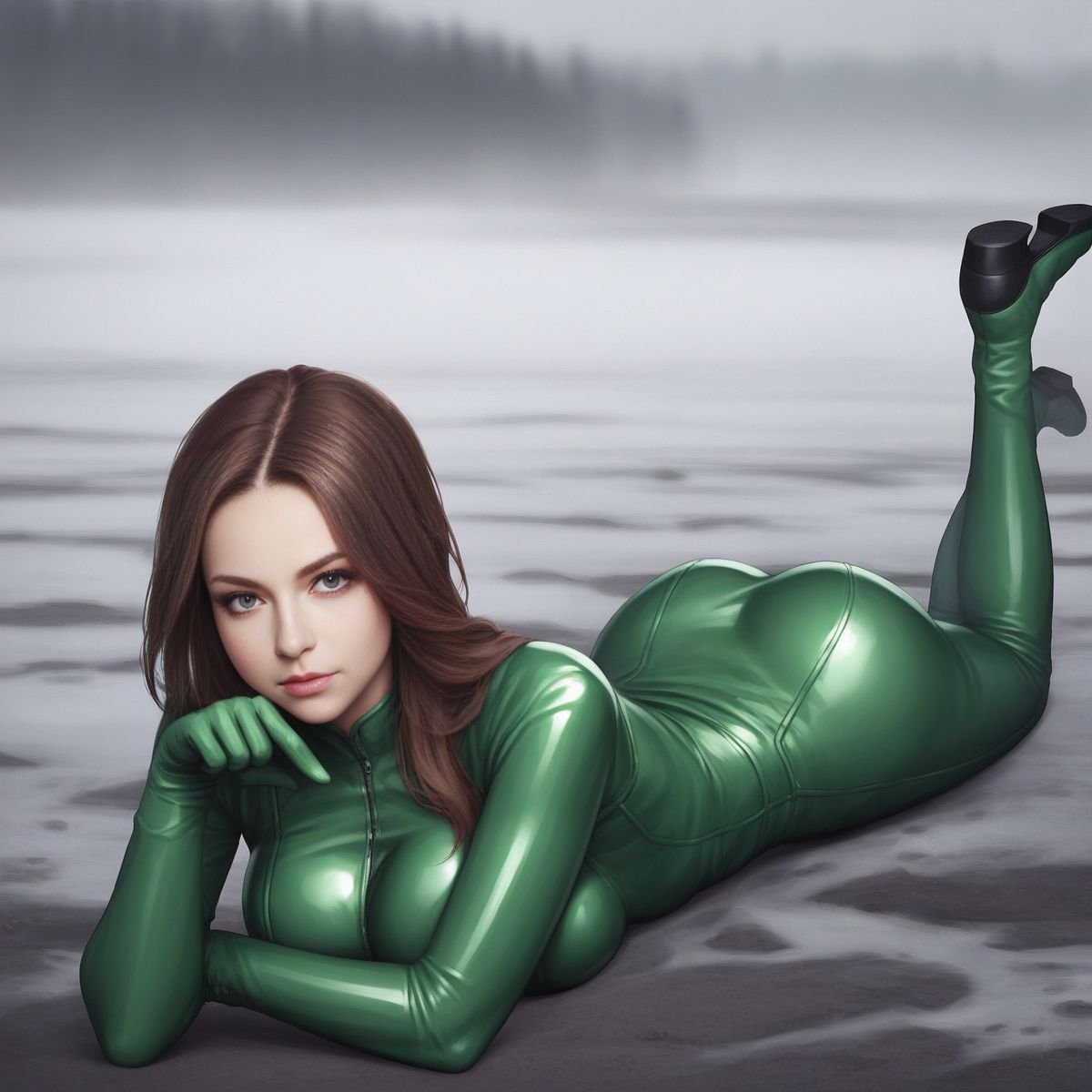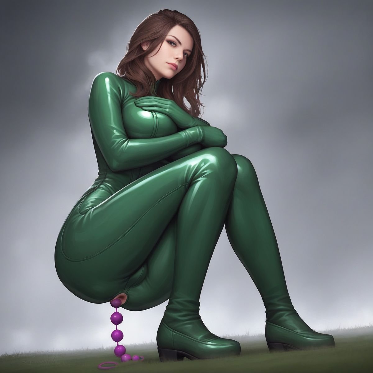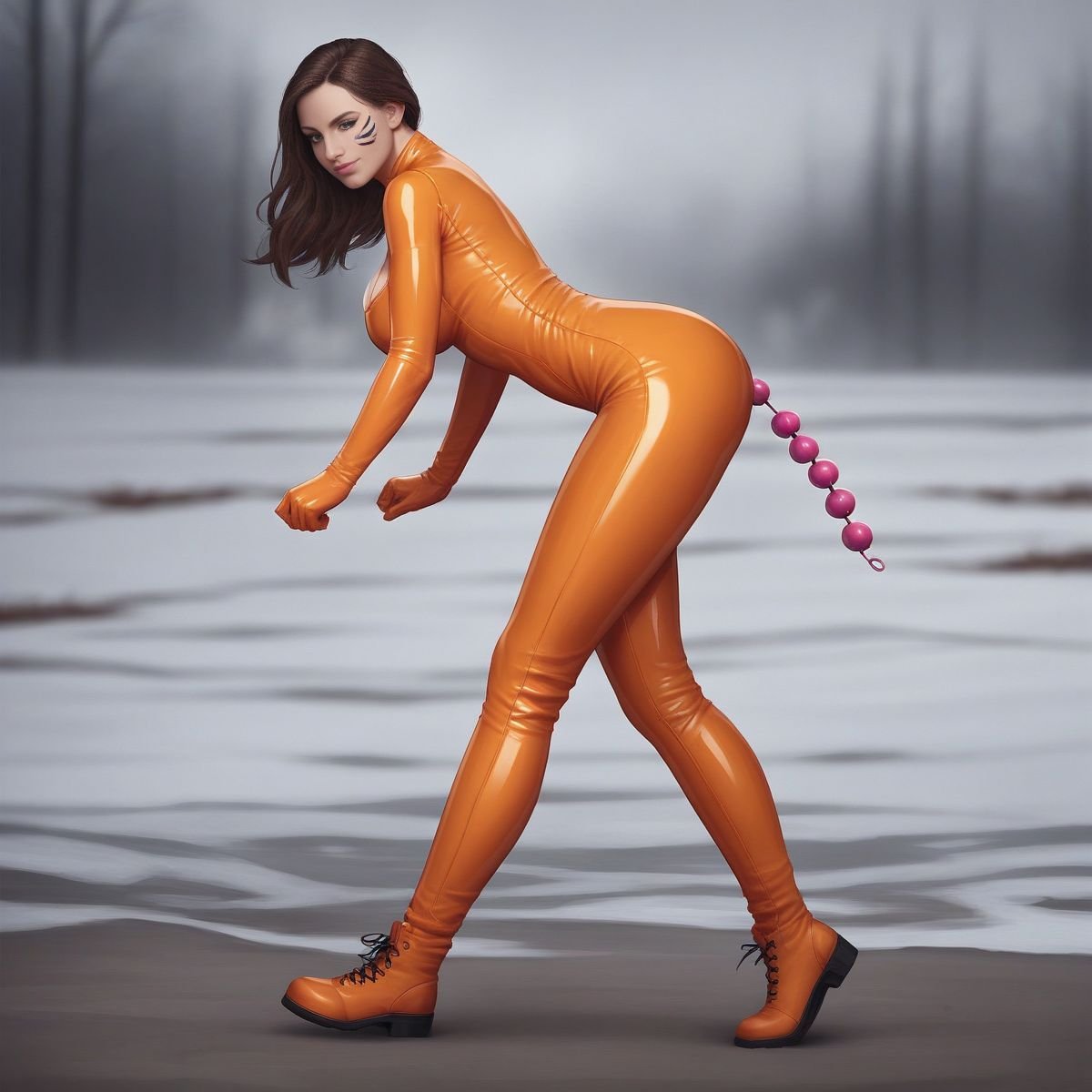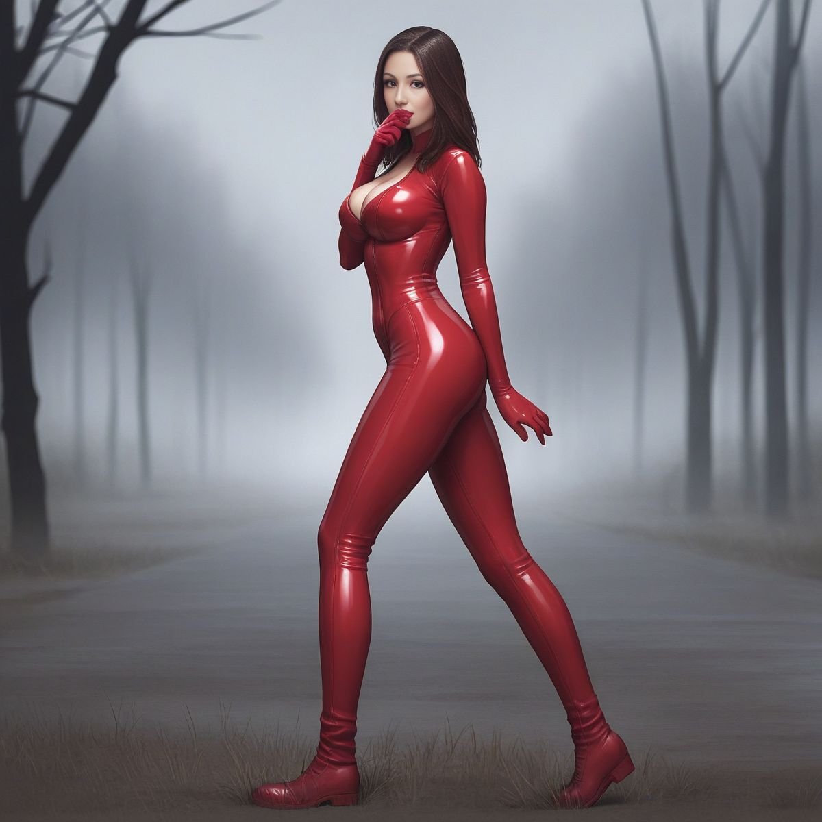 The fog was just wet and cold, the kind that made the park feel like a drained fish tank. Late February air scraped my face, but under the latex, I was cooking. The suit was skin-tight, a slick, second layer that showed off every damn curve. My tits were ridiculous in it, two huge, soft weights pushed up so high I could feel them against my chin if I slumped. The nipples were hard, pressing against the shiny black rubber like they were trying to poke through. The tattoo on my forehead, a jagged little scribble, was the only thing that didn’t shine.