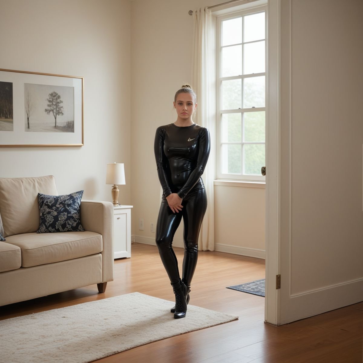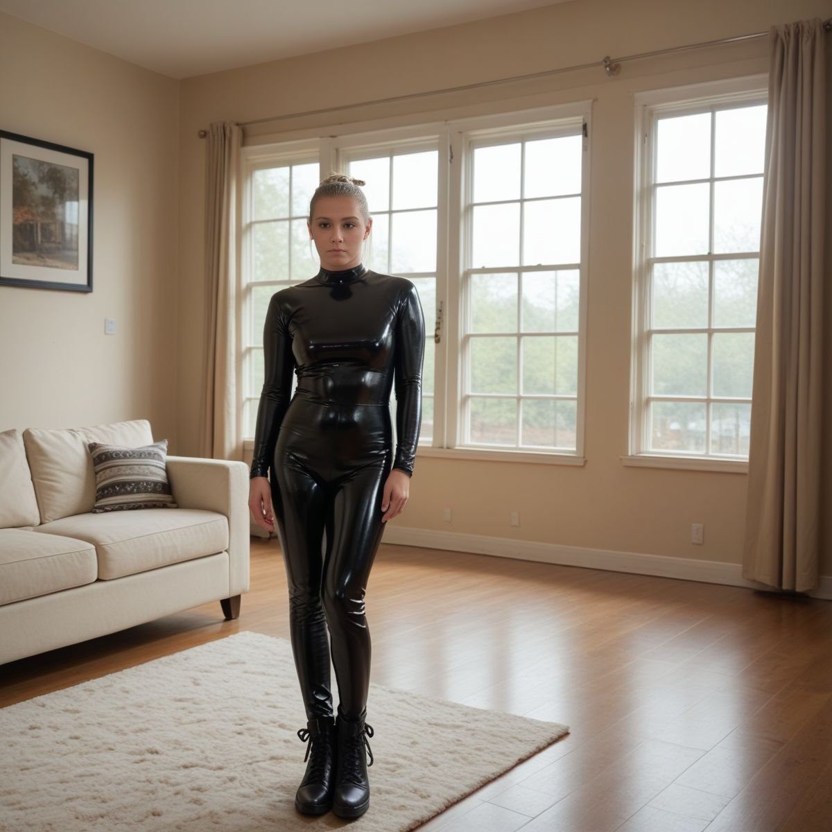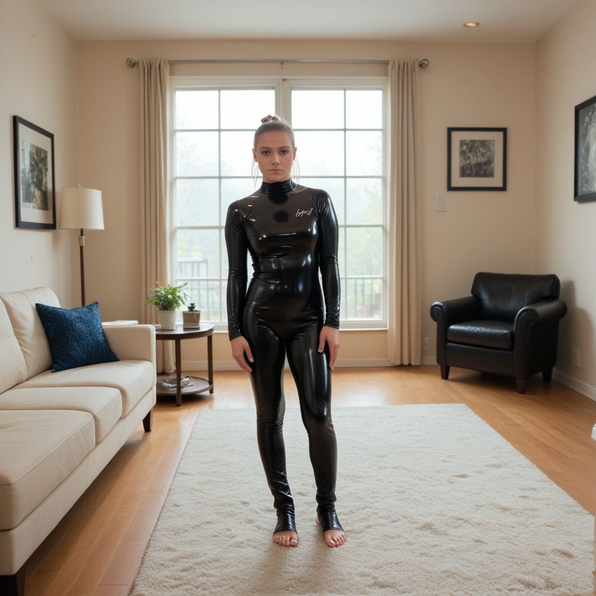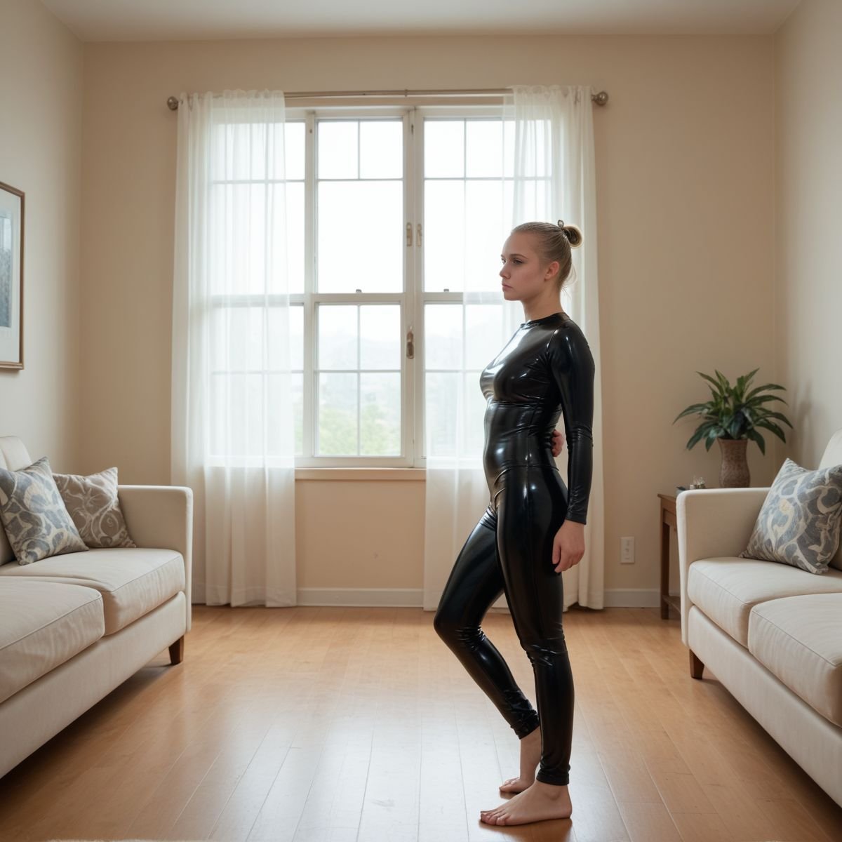 The bright afternoon sun of mid to late April is pouring into Jade’s living room, filling the space with warm golden light. The early twenties blonde stands right in the middle of it wearing her sleek black latex catsuit with no zippers. The seamless material clings tightly to her slim and toned athletic figure, hugging every curve like a second skin.