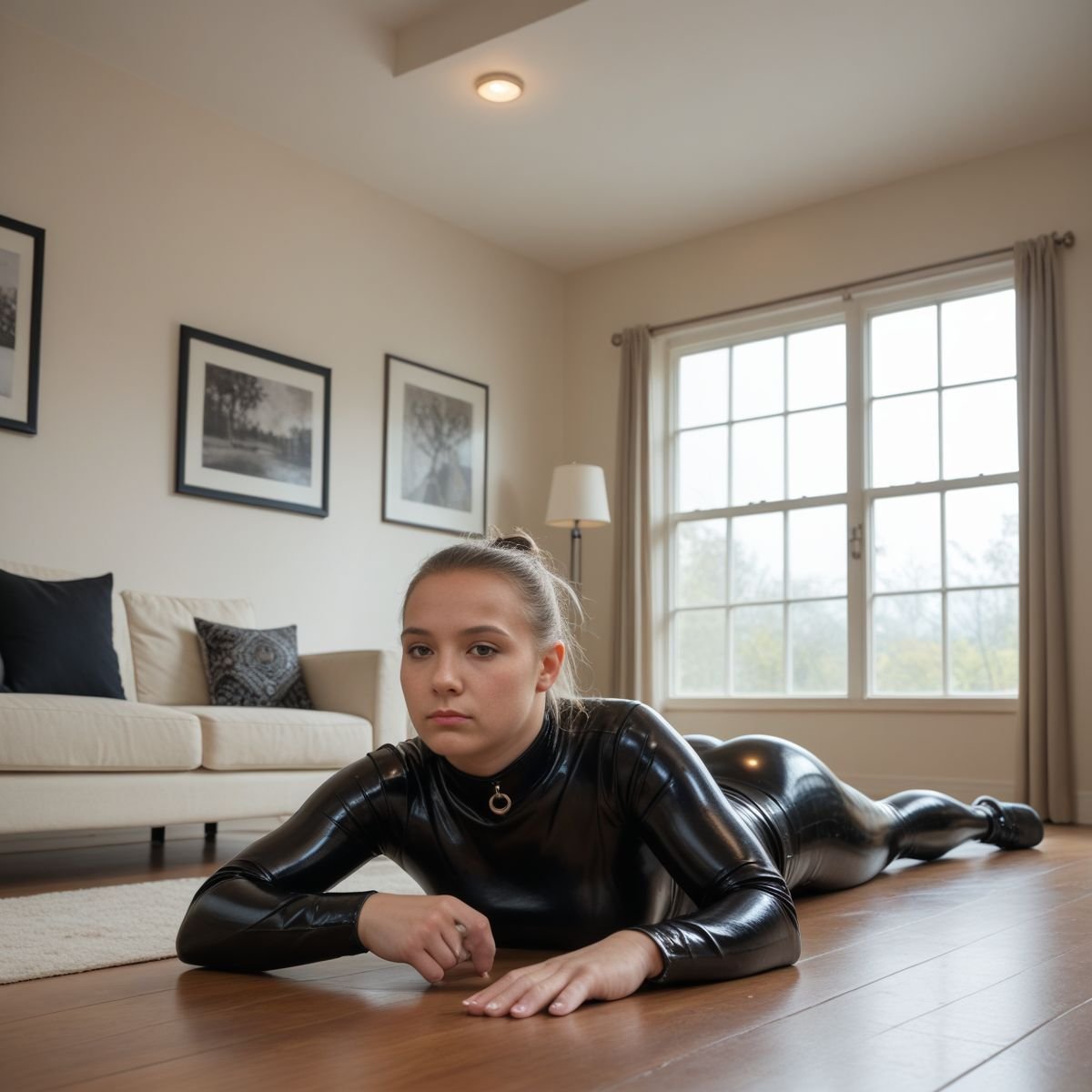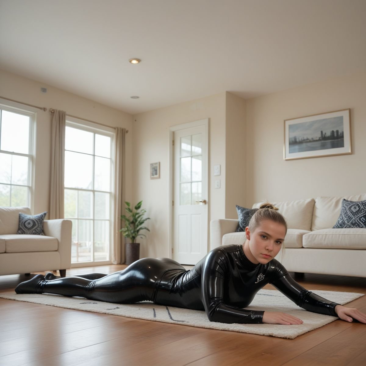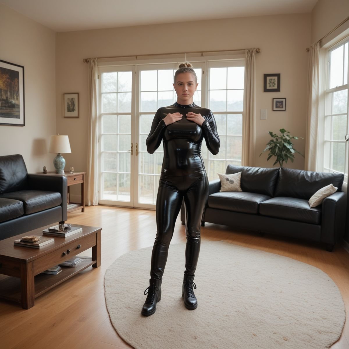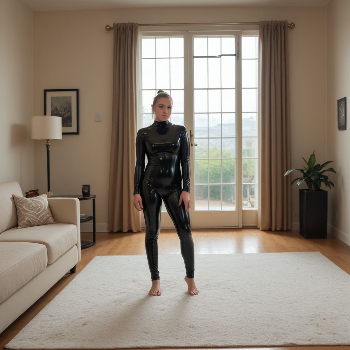 The bright afternoon sun of mid to late April is pouring into Jade’s living room, filling the space with warm golden light. The early twenties blonde stands right in the middle of it wearing her sleek black latex catsuit with no zippers. The seamless material clings tightly to her slim and toned athletic figure, hugging every curve like a second skin.