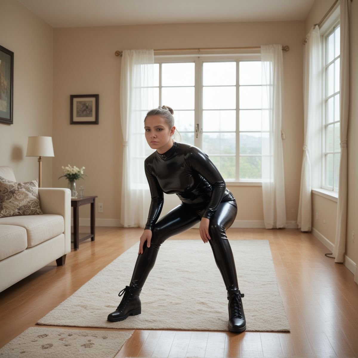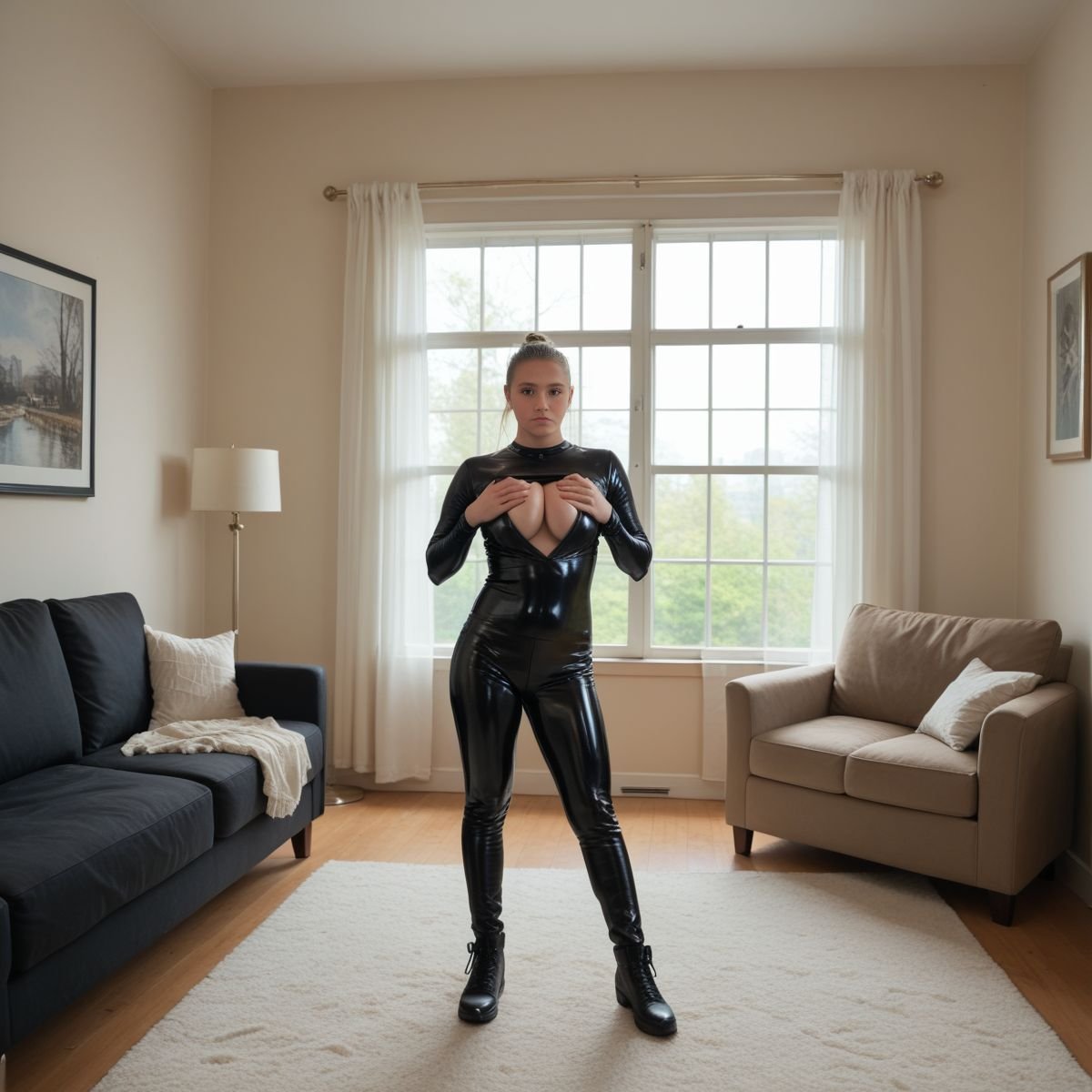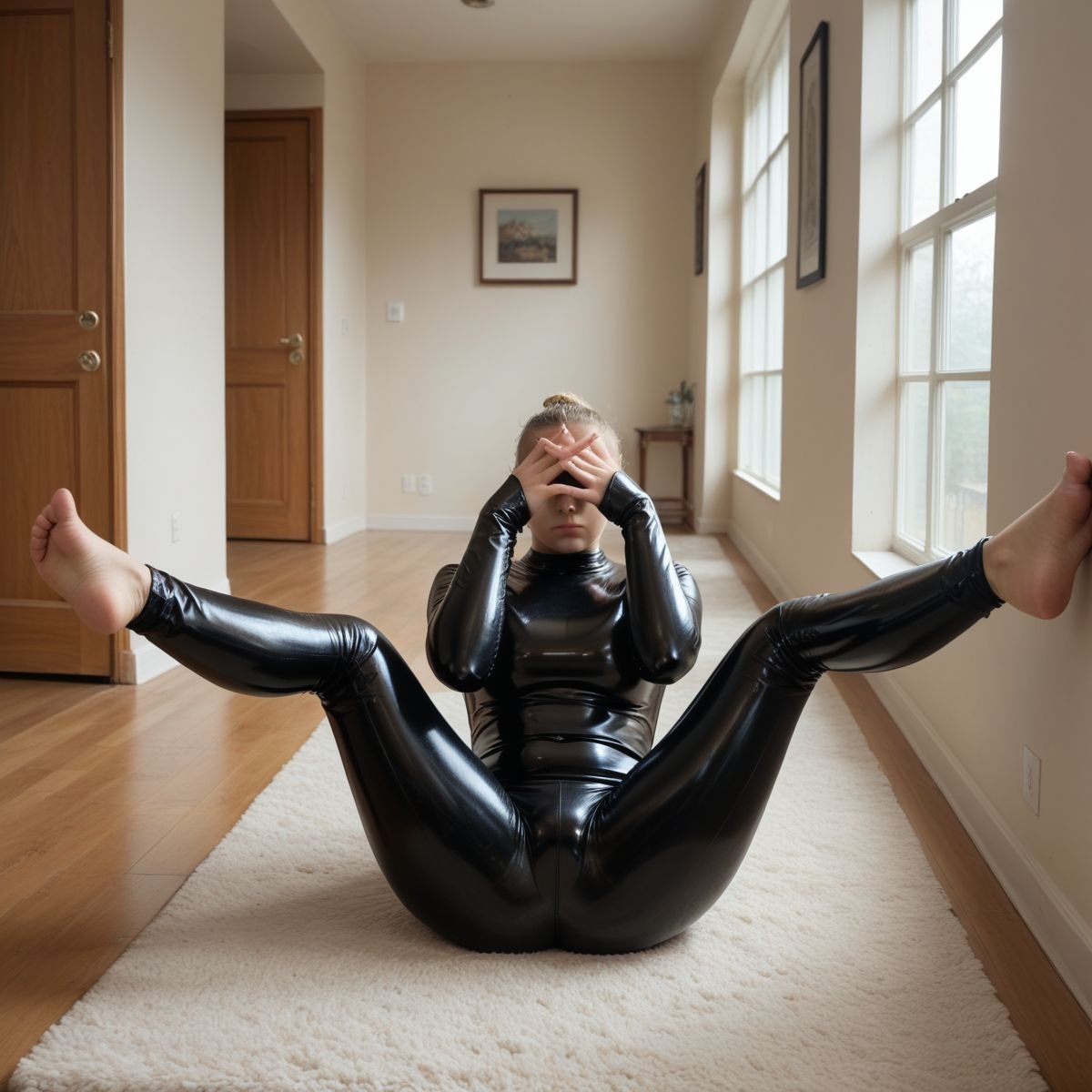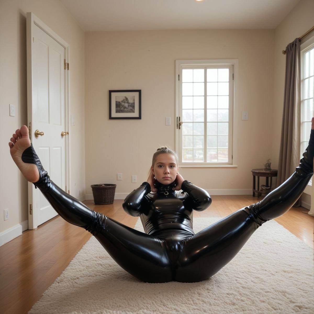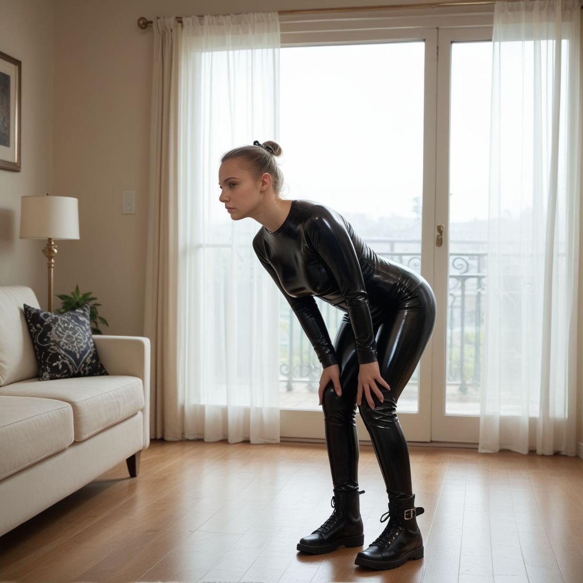 The bright afternoon sun of mid to late April is pouring into Jade’s living room, filling the space with warm golden light. The early twenties blonde stands right in the middle of it wearing her sleek black latex catsuit with no zippers. The seamless material clings tightly to her slim and toned athletic figure, hugging every curve like a second skin.