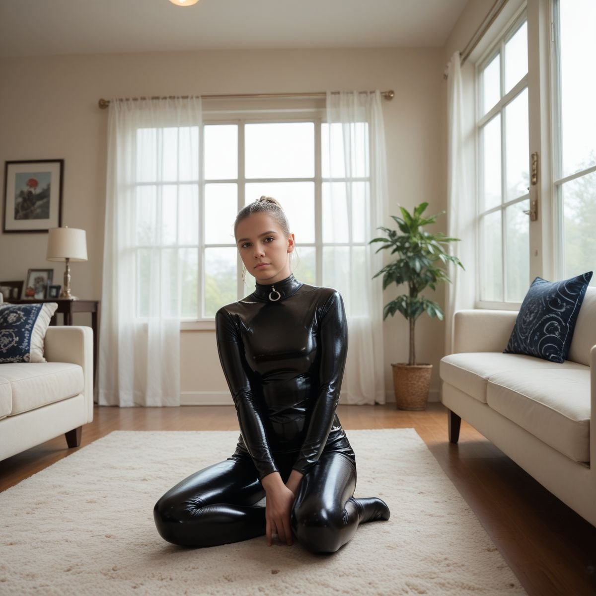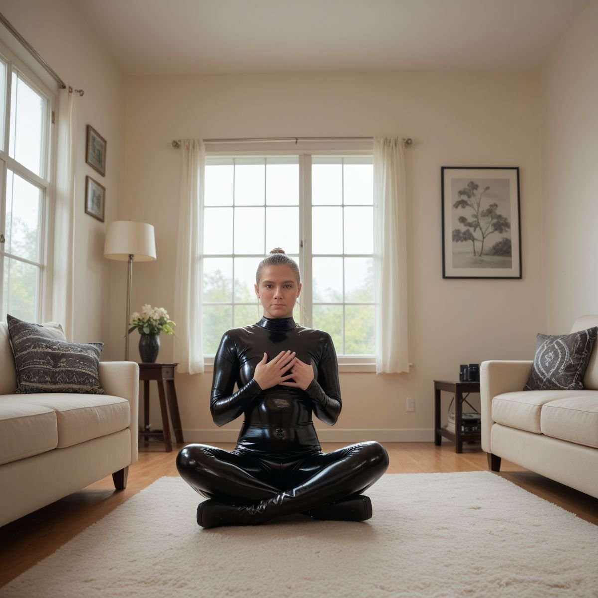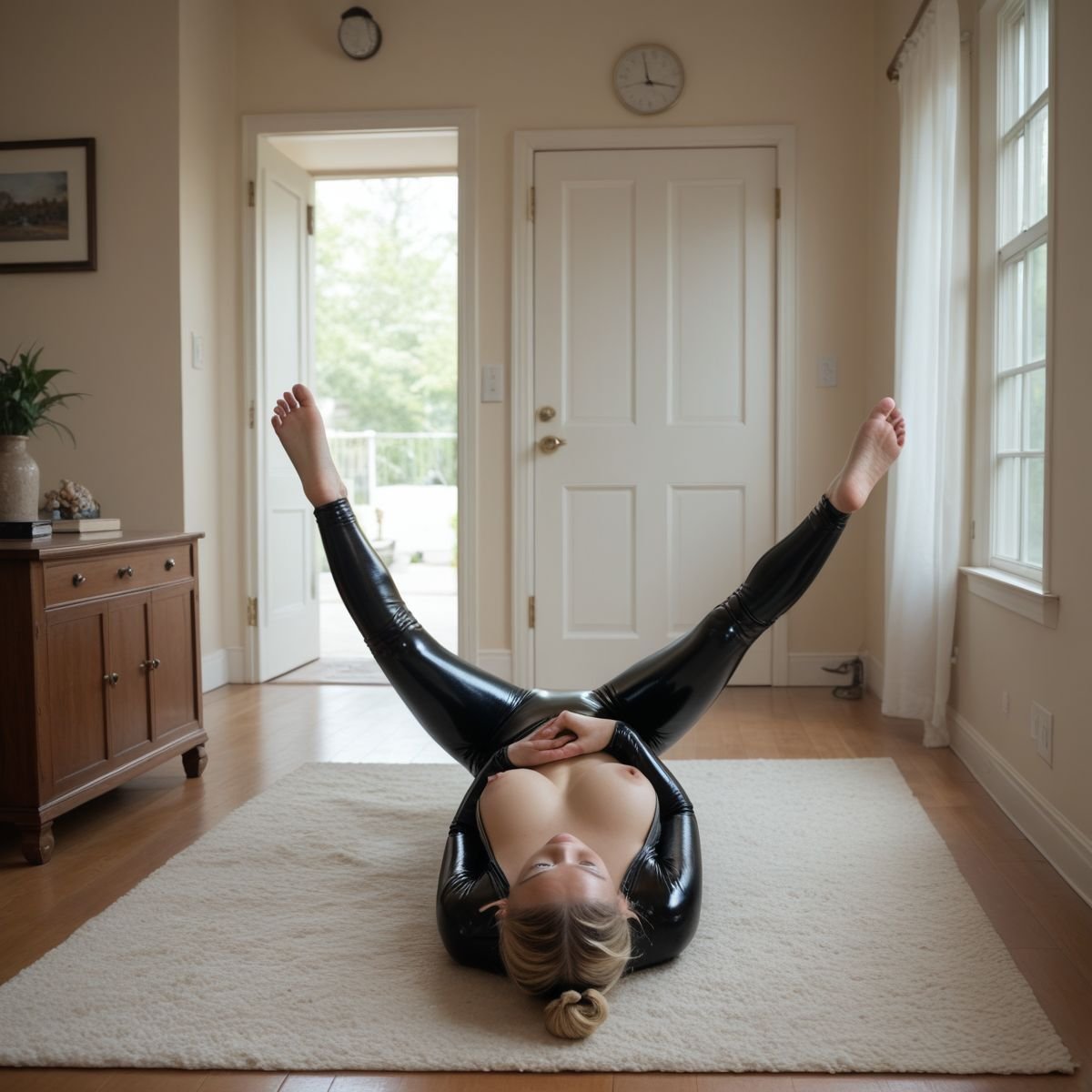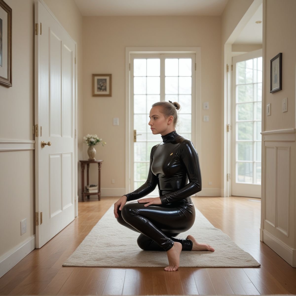 The bright afternoon sun of mid to late April is pouring into Jade’s living room, filling the space with warm golden light. The early twenties blonde stands right in the middle of it wearing her sleek black latex catsuit with no zippers. The seamless material clings tightly to her slim and toned athletic figure, hugging every curve like a second skin.