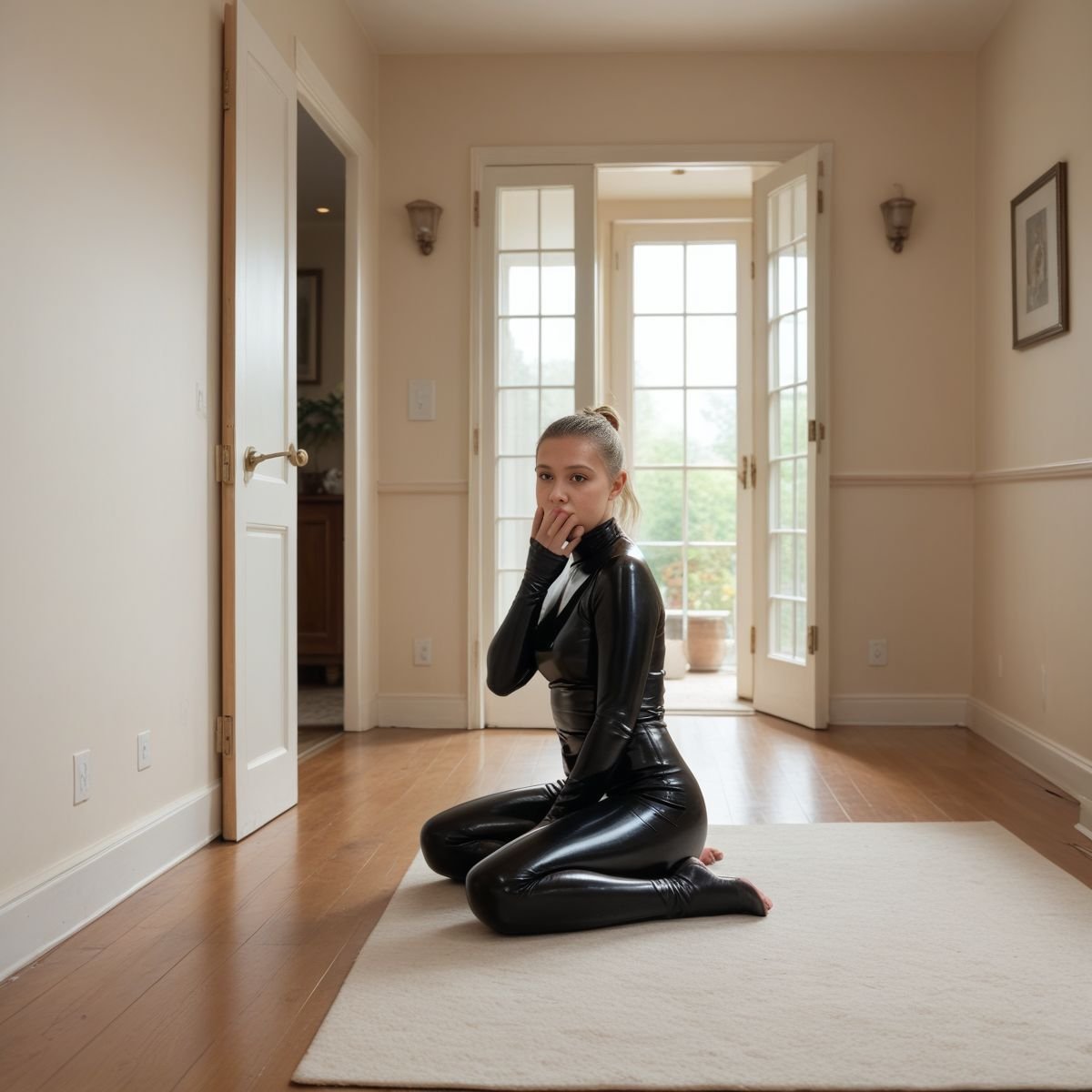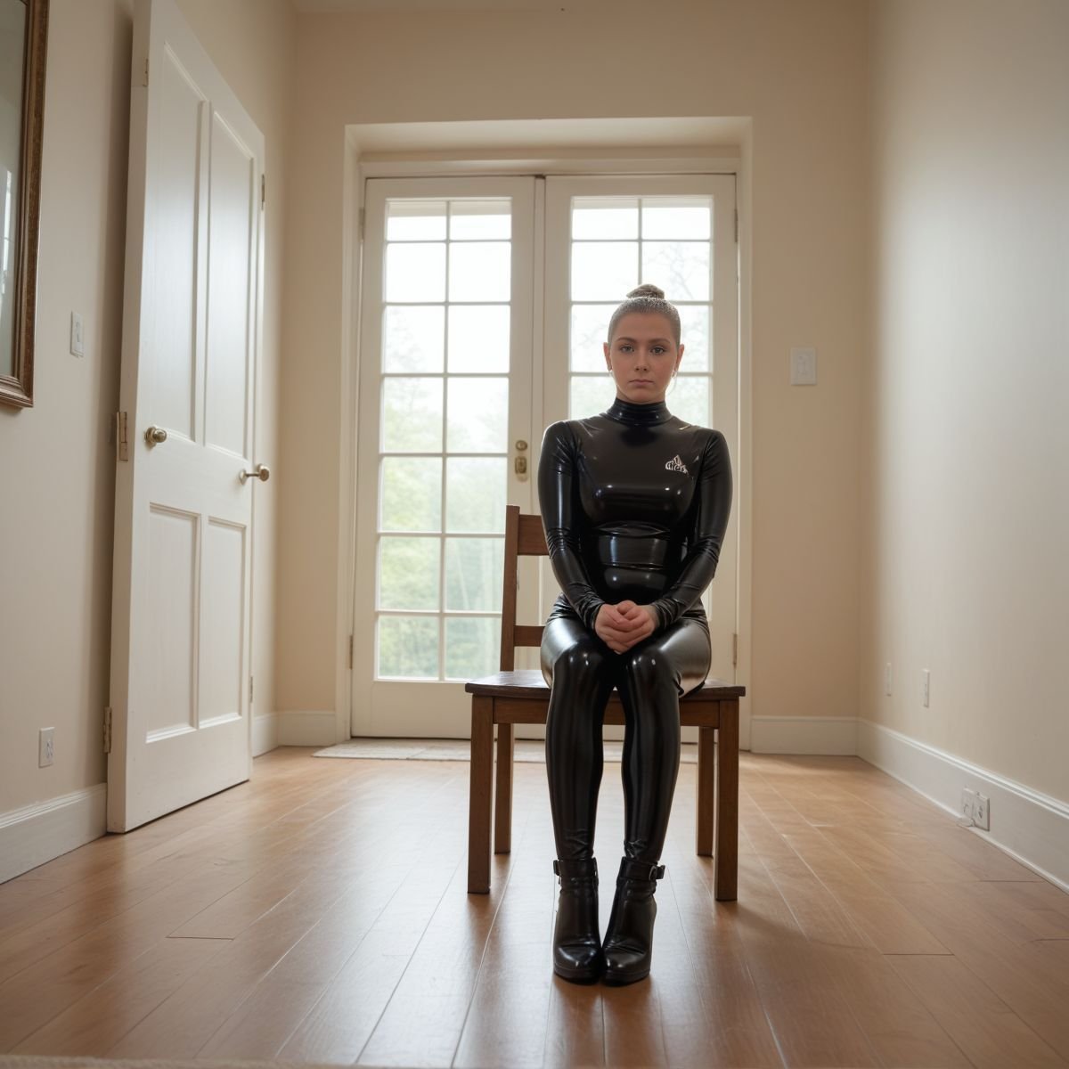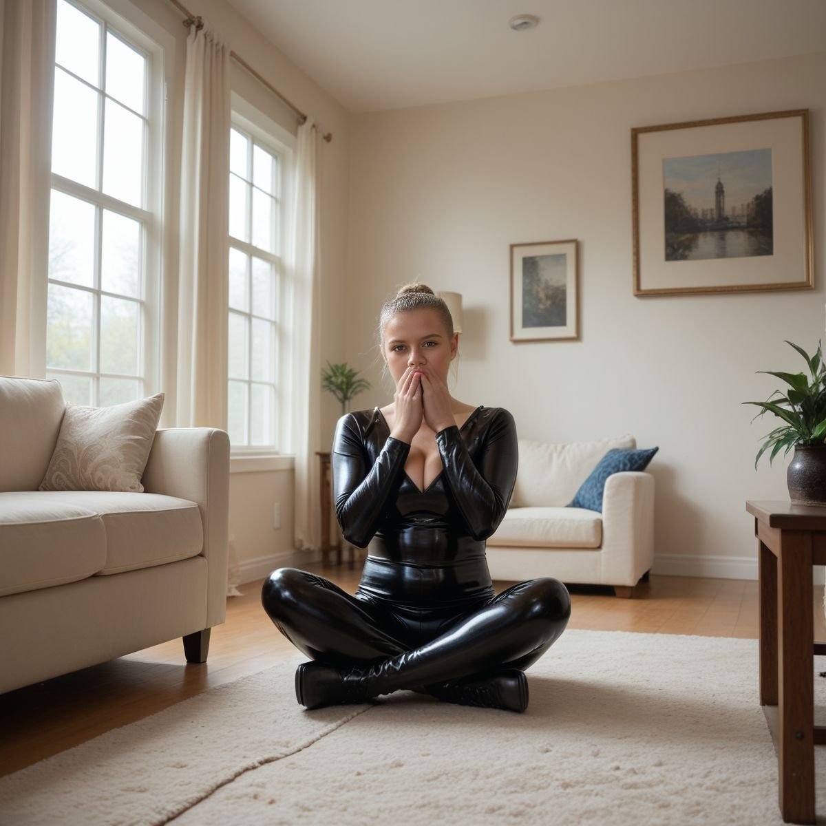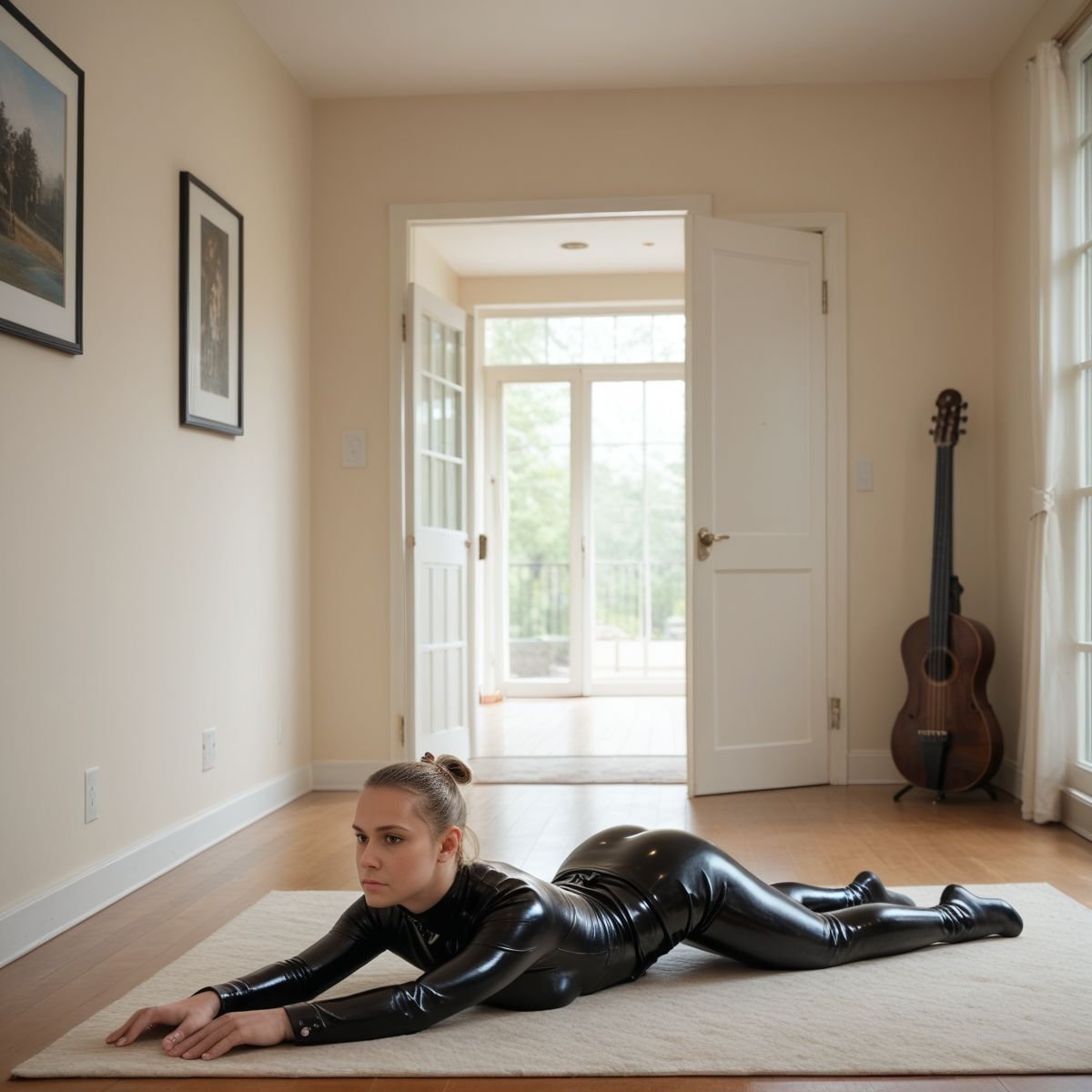 The bright afternoon sun of mid to late April is pouring into Jade’s living room, filling the space with warm golden light. The early twenties blonde stands right in the middle of it wearing her sleek black latex catsuit with no zippers. The seamless material clings tightly to her slim and toned athletic figure, hugging every curve like a second skin.